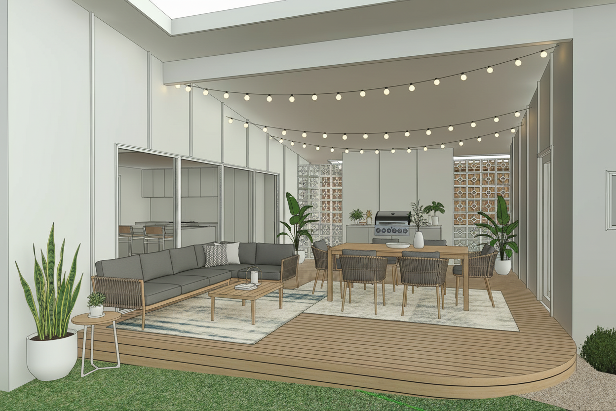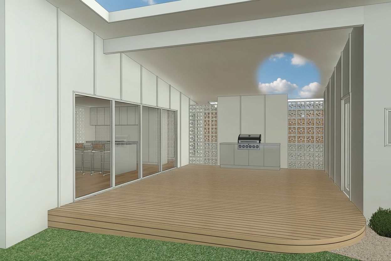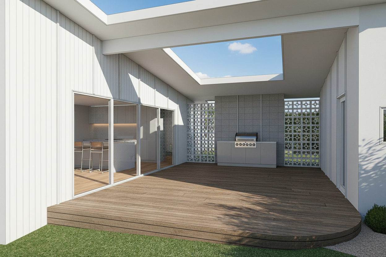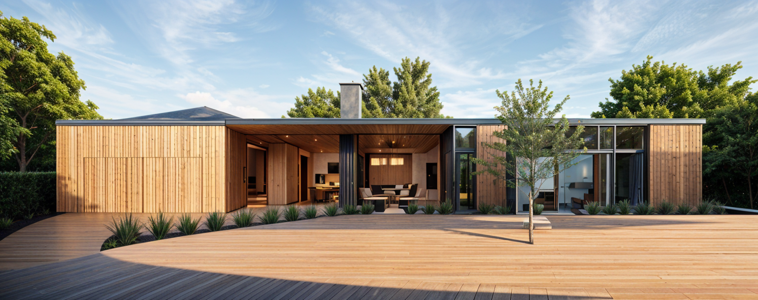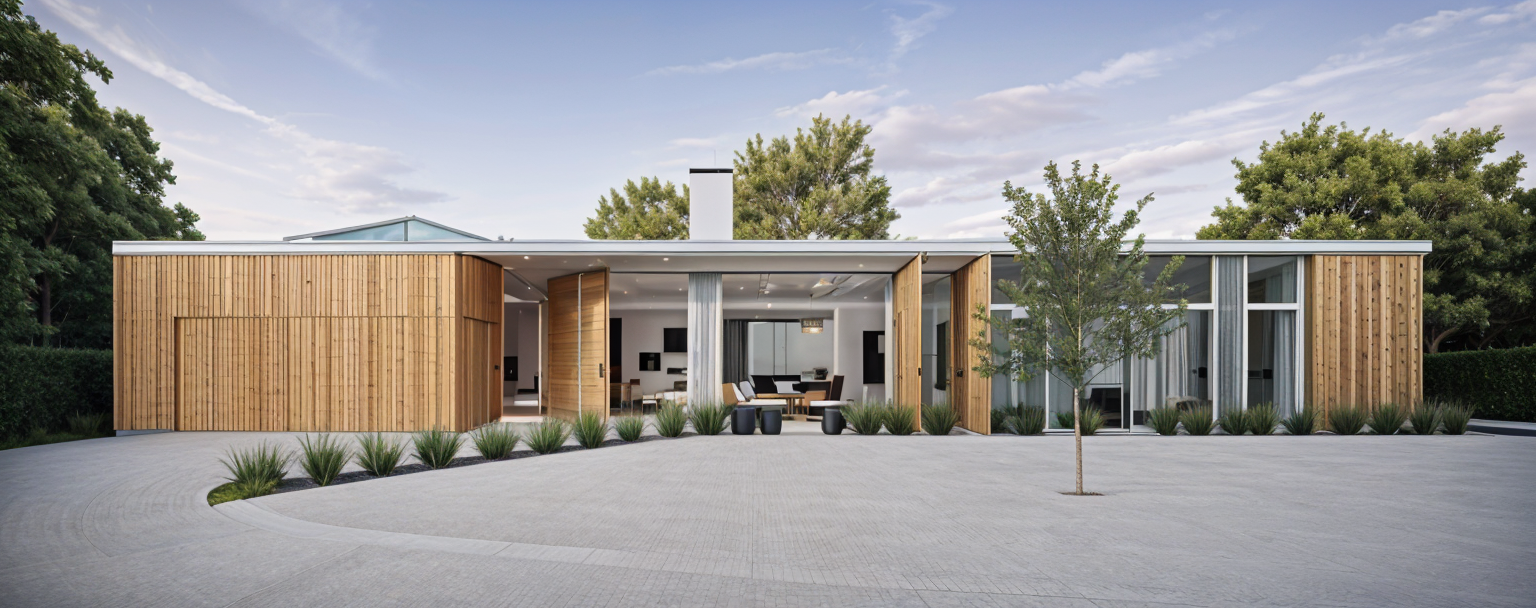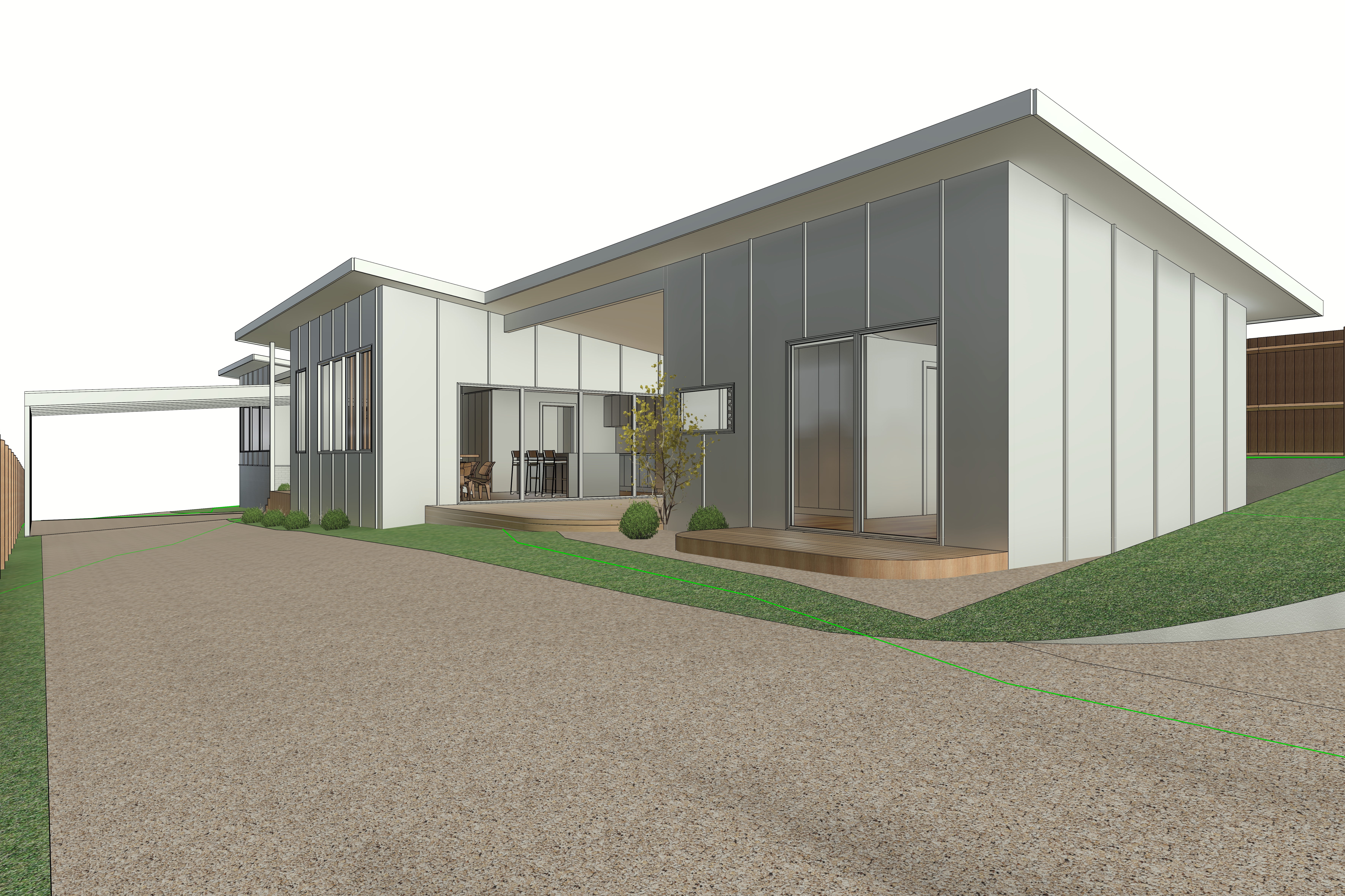 keep the geometry of the existing image modern palm spring style home board and batten cladding white keep the scene warm lit with all white exterior and warm interior where visible landscaping around the dwelling should be native australian planting large gum trees behind the dwelling with partly cloudy sky with morning sunlight lighting the face of the dwelling