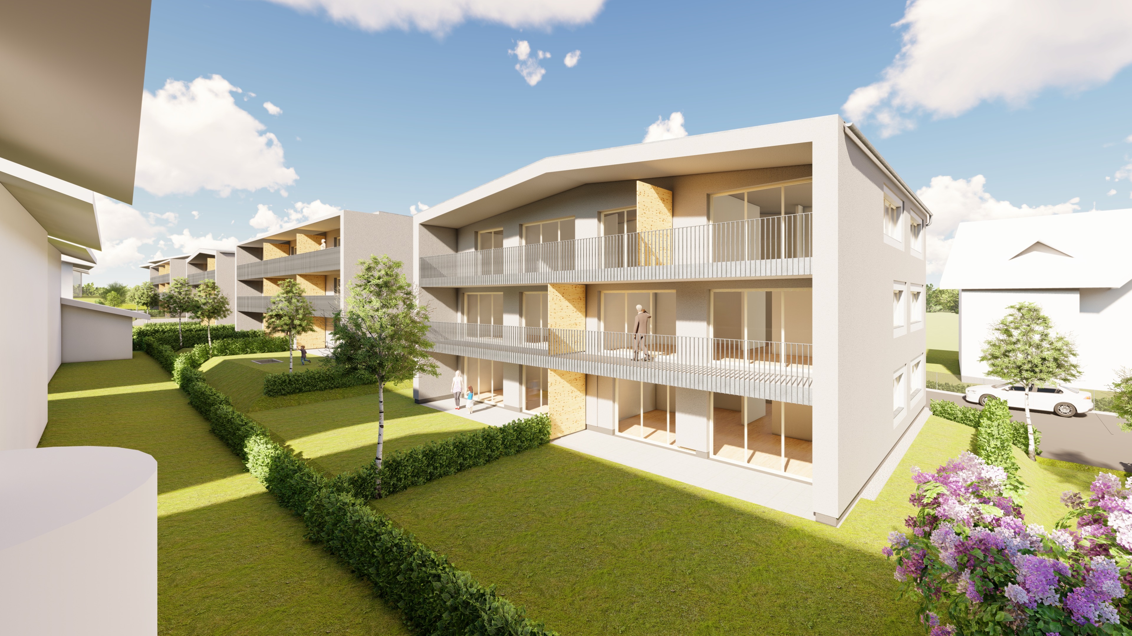 render the scene on a beautiful spring day the materials must be retained the facades in smooth gray plaster the windows as white plastic windows the balcony railings in galvanized dark steel the balcony partition walls made of wood depict the lawn realistically add a few people to the image the entire image in realistic and lively light mountainous background