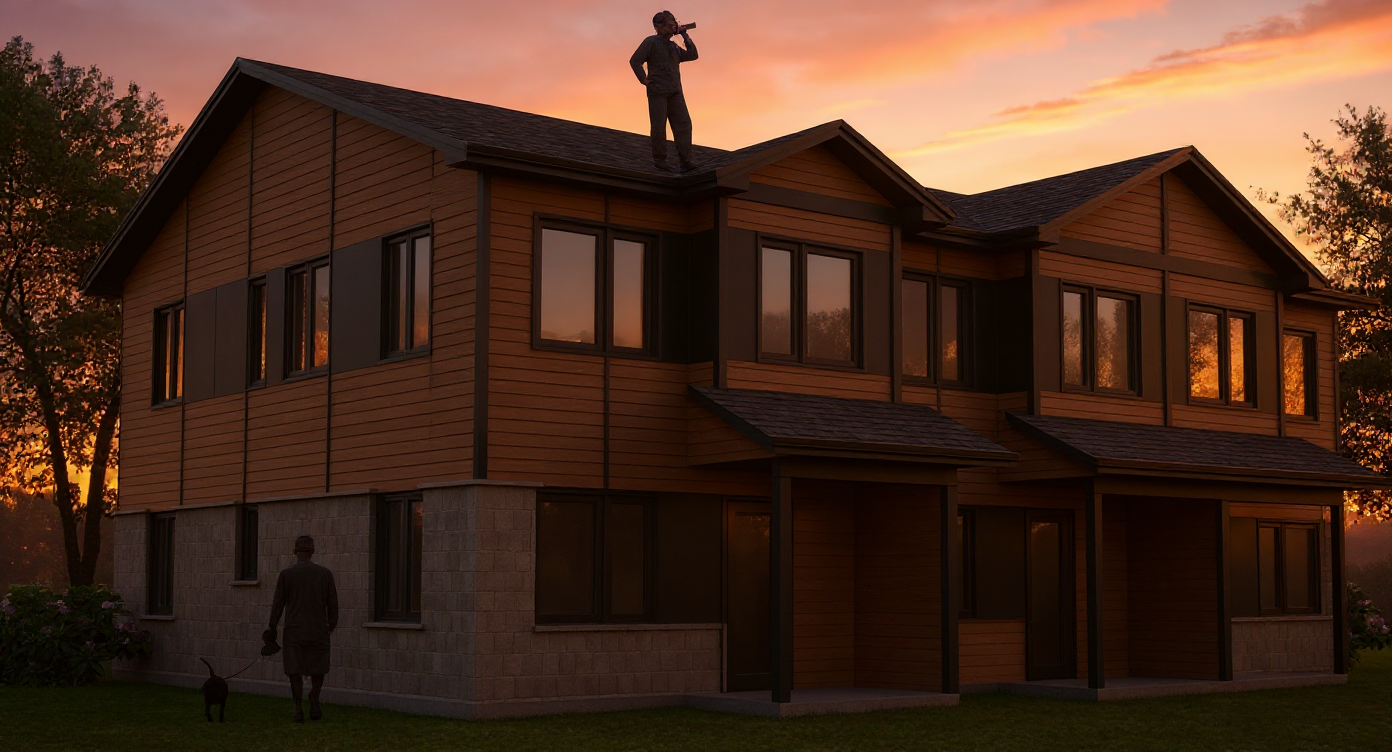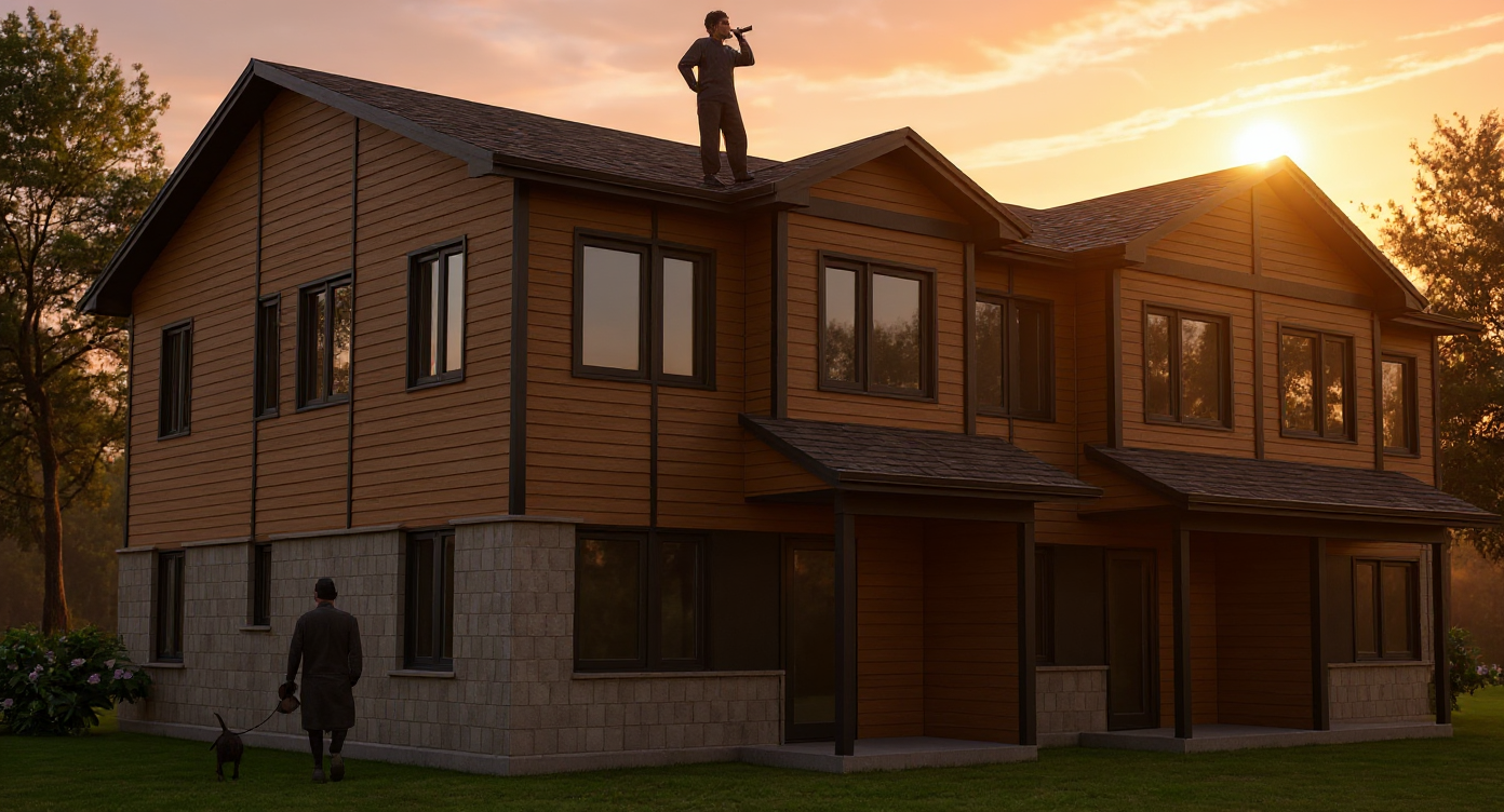 prairie style texas ranch land setting with foundation planting and wildflowers mottled brown roman brick bronze paint on doors windows fascia texas live cream colored window frames oak trees in yard taper walk up to front porch gravel drive to garage door no wall light by garage door texas red blue and yellow wild flowers in yard ramp sidewalk up to front porch ledge at base of house is concrete more foundation plantings and wildflowers