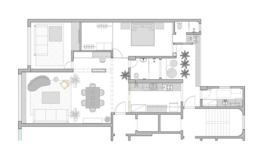 modernist interior shot floor plan rendered beautifully with a modern minimalistic style use a soft neutral color palette with warm whites light grays and natural wood tones incorporate indoor plants with lush greens add cozy yellow lighting for ambient warmth emphasize clean lines and a spacious layout to create a sense of tranquility and openness the atmosphere should be inviting calm and elegantly sophisticated architecture