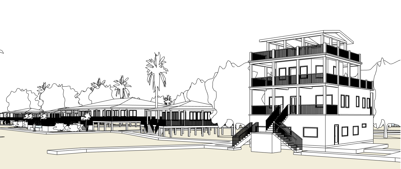 terracotta stucco siding white posts white railing for large building very light blue wood shake shingle siding for smaller building very light yellow wood shake shingle siding for other building tropical background with sand for the ground