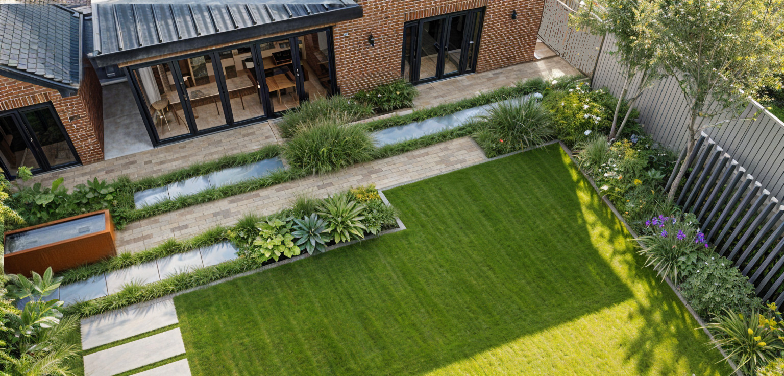 turn this into a night time photo with uplighting around water feature and under the trees and posts wall lights on the house a couple of recessed lights around the edge of the path in the planting subtle lighting