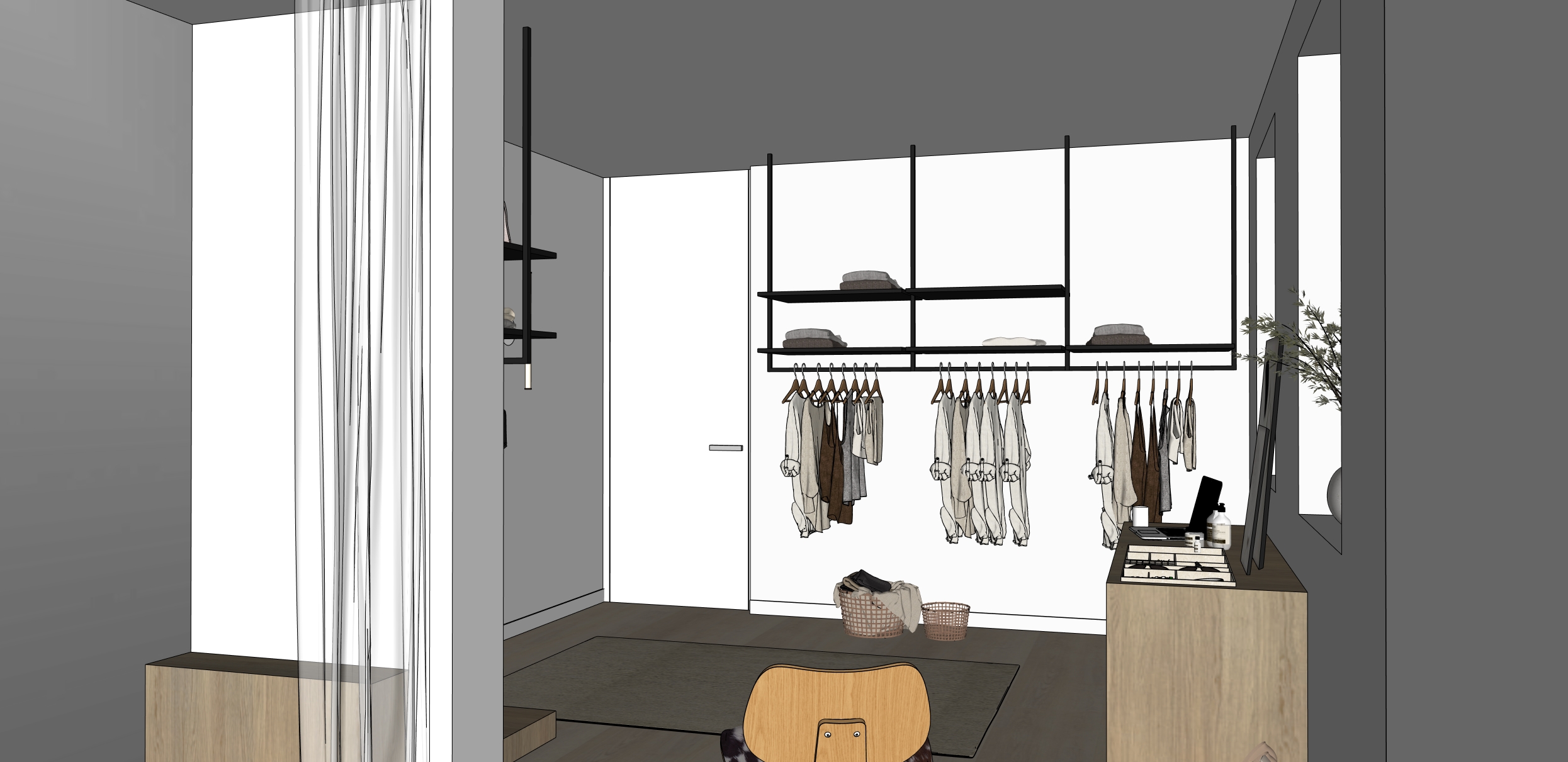 make this sketchup interior photo realistic in the mirror we see a person trying on clothes in natural tones