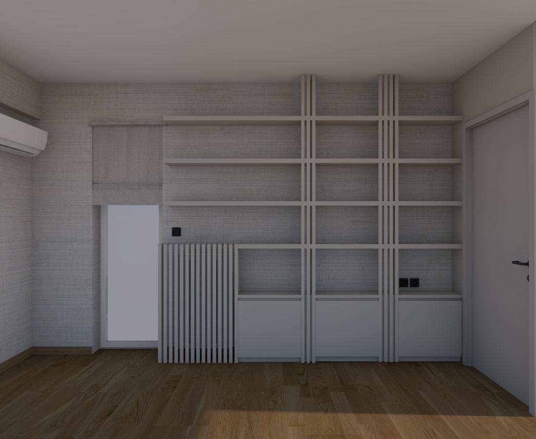 apply to the floor a light oak wood smooth and delicate realistic view calm minimal the view of the window is white three books one the shelve and one play the wallpapar fabric one the wall wood floor apply led lighting on the shelves