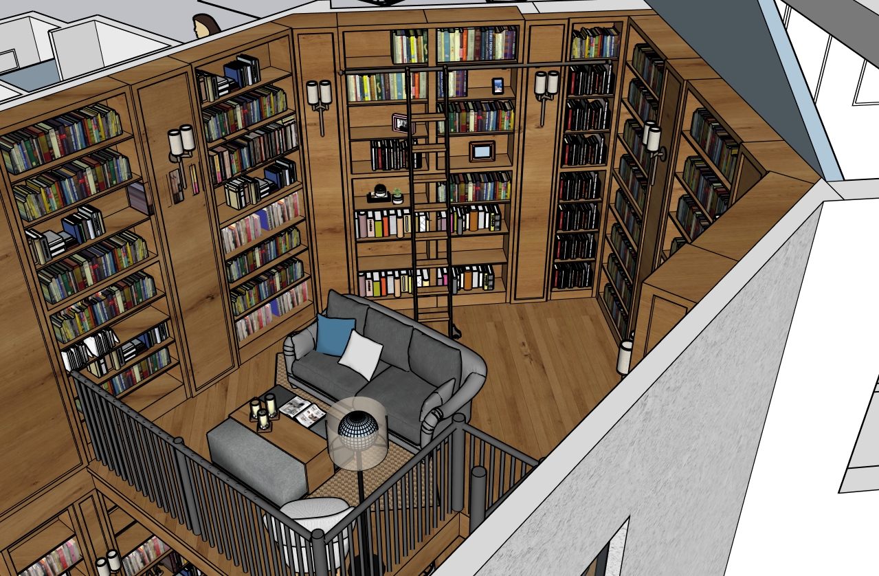 new urbanism interior shot a cozy modern library interior with warm wooden bookshelves filled with colorful books and warm paneled walls wood planks on the ceiling and wood doors into space the atmosphere is serene and inviting featuring a spiral staircase with sleek gray metal and wooden steps a soft white floor lamp casts a gentle glow over a stylish black armchair and green potted plant bright blue sky visible through a large window adding a touch of natural light the overall ambiance is peaceful and sophisticated colors in the space is warm wood blues and greys architecture