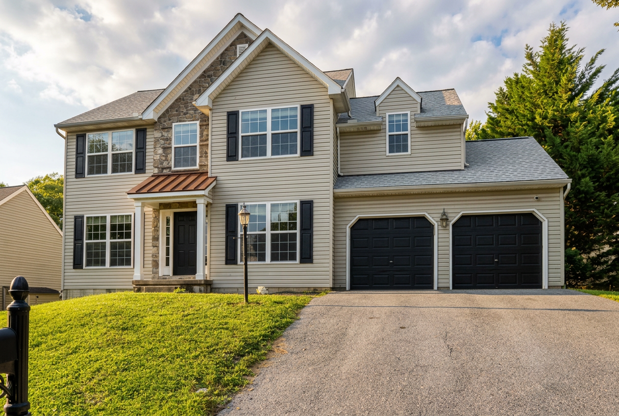 keep everything the same but add some 4 white hydrangeas to the front of the house by the windows on both side make the tan siding a burgundy color