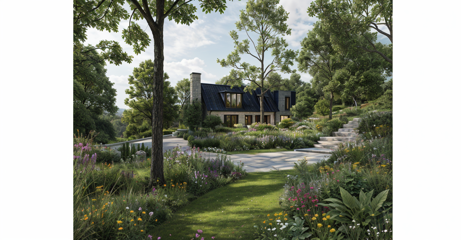 one large round stone planter bed with layered greens at varying and seating around the perimeter