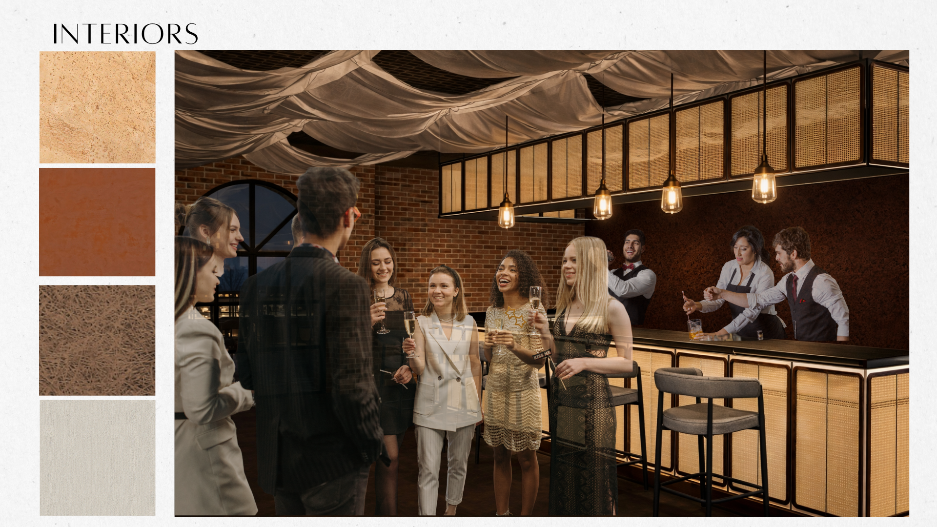 transform the provided restaurant interior image into a high end photorealistic render with warm golden hour atmosphere soft glowing highlights and relaxed upscale coastal energy while keeping everything exactly the same same proportions same bar shape same booth seating same ceiling curves same wall finishes same yellow curtains same materials and same spatial configuration do not move or alter any objects geometry textures colors or furniture positions the chairs throughout the restaurant must remain exactly in the same locations and proportions but their materials should read realistically the bar stools should appear upholstered in soft reddish brown leather with subtle natural sheen and cushioned tactile texture the dining chairs at the tables should appear in the same reddish brown tone but upholstered in soft velour with a matte plush surface and gentle directional nap while keeping their shapes frames and positions unchanged add premium table settings including wine glasses champagne flutes tropical style cocktails elegant plates cutlery cloth napkins and a seafood tasting arrangement with oysters while keeping all tables and chairs in their exact positions include modern young guests seated at the bar and at selected tables casually social correctly scaled tastefully integrated without crowding or obstructing architectural details add two bartenders behind the bar preparing drinks and interacting naturally while preserving the bar s structure and alignment the mosaic seafood display counter must clearly appear filled with ice fish lobsters shrimp and shellfish with cool reflections moisture and texture while keeping its exact position and shape unchanged on the bar shelves add wine bottles and premium alcohol bottles arranged tastefully and evenly while keeping the shelving structure unchanged the shelving should feature warm and bright accent lighting enhancing reflections and bottle silhouettes the wall behind the bar shelves must clearly appear as amber glass in a deeper richer golden amber tone with a ribbed textured surface and illuminated from behind with warm vivid backlighting while maintaining its exact geometry proportions framing and alignment lighting should emphasize golden hour warmth gentle reflections soft shadows enhanced color richness and luxurious catalog level realism improve depth and realism through wood grain richness marble shine brass highlights fabric texture and polished clarity while keeping the entire scene exactly as originally designed