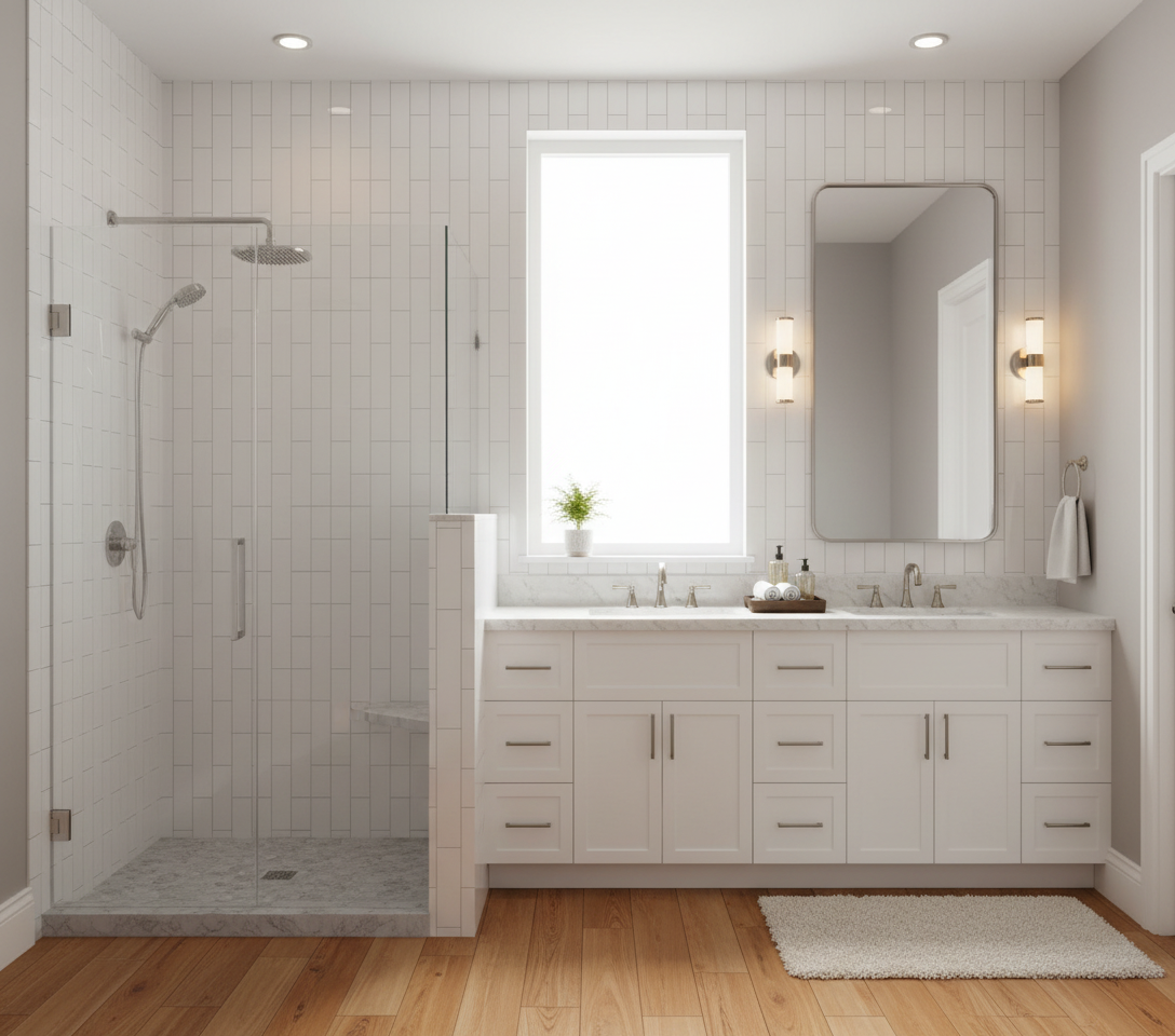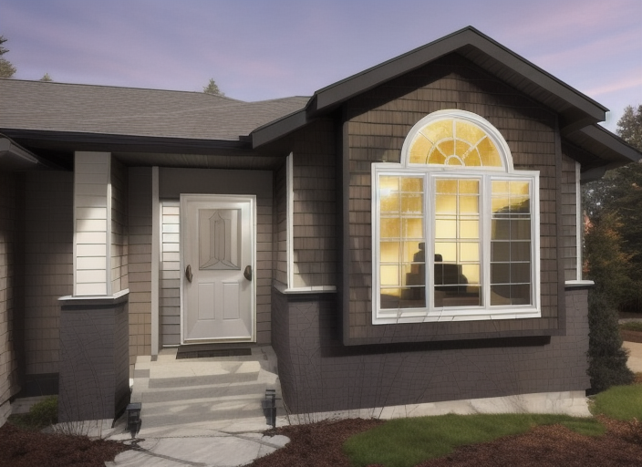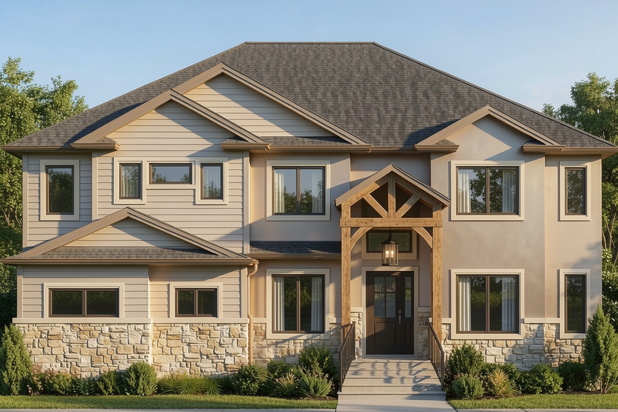 make as photorealistic as possible while keeping textures the same as selection professional landscaping in a lightly wooded scene with good lighting match materials to plan and remove any text vinyl beige siding beige shakes brown shutters and sw3541 stained posts white windows white soffit black shingles