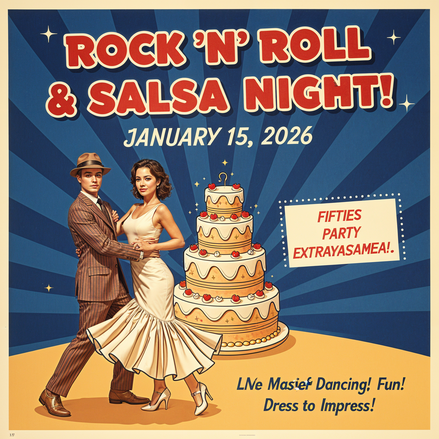 make a banner for fifties party date on it 15 1 2026 cake and some well dressed latino mafia lady and gentleman from ny mention salsa