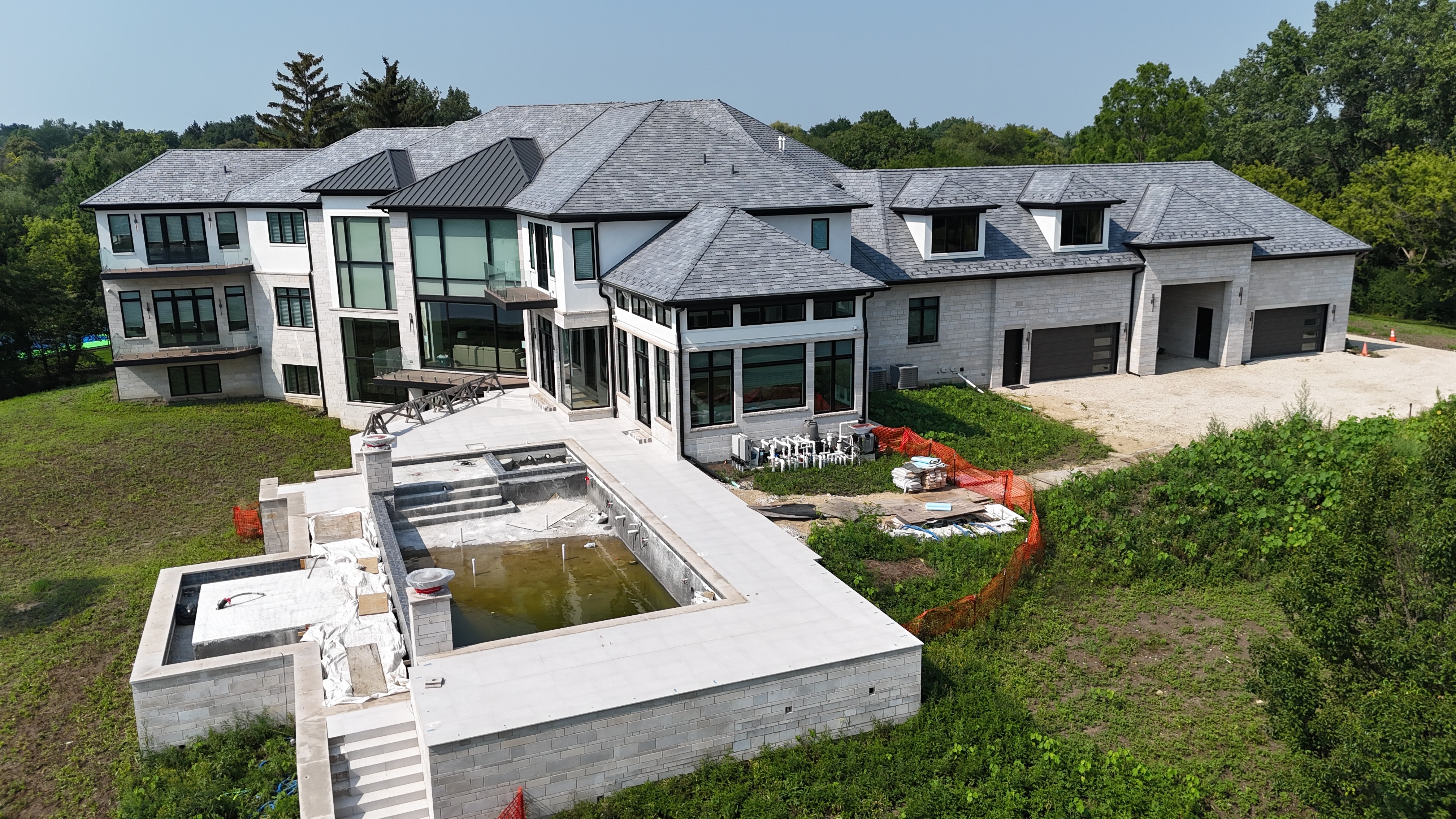 remove orange fence hide pipes add pool water add trees add small plants add 2 people in swimsuits by pool enhance blue sky