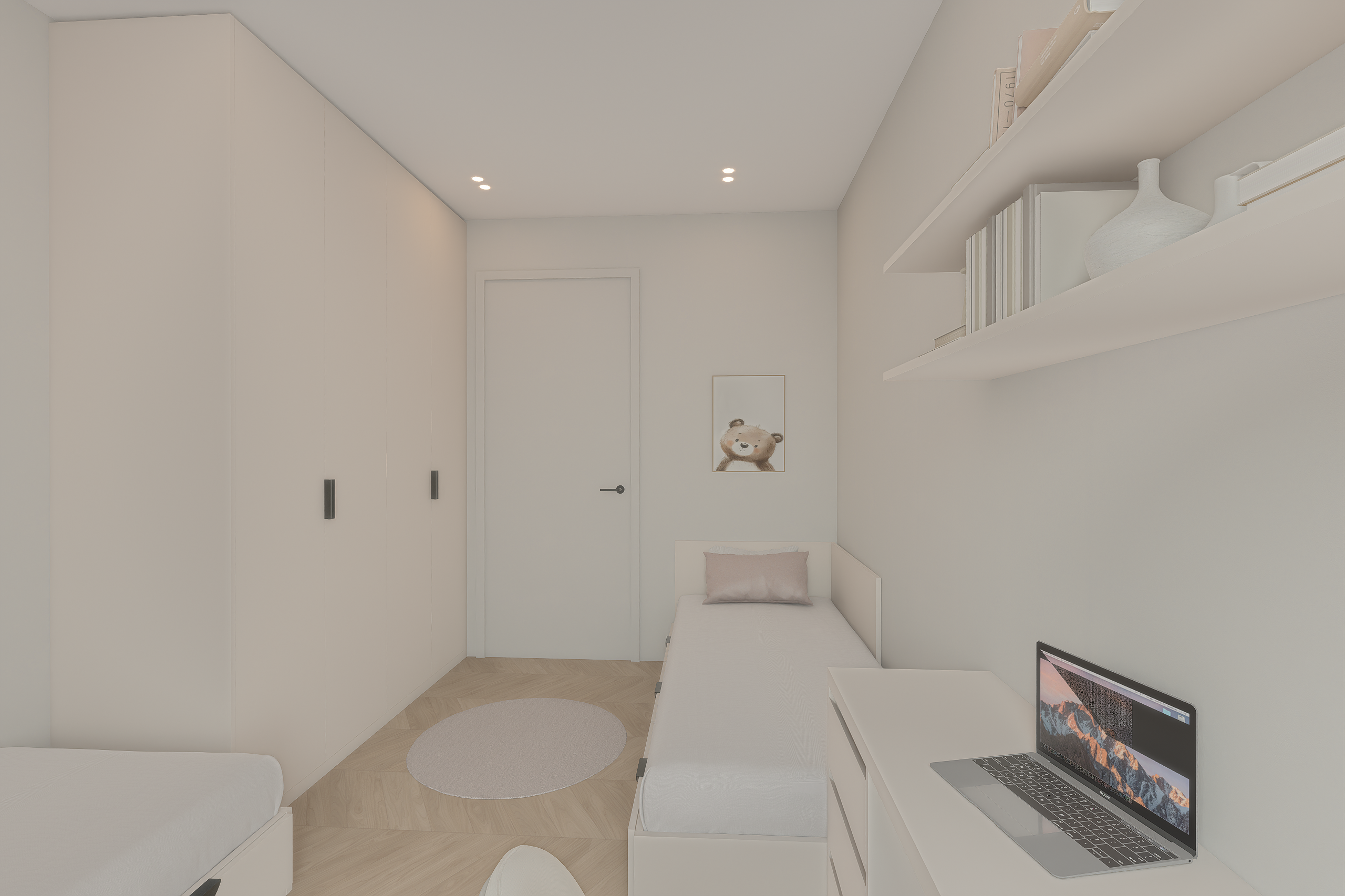 ultra realistic render of a soft modern kids bedroom keeping the exact same design layout camera angle furniture placement and proportions from the uploaded image do not change the design preserve the long built in light cream matte wardrobe on the left with slim dark handles the single bed on the right the small desk with drawers the open floating shelves above the minimal wall art the round light rug the white door and the light oak herringbone parquet floor exactly as shown keep the whole room in a warm neutral palette of cream beige and soft off white tones make all materials look highly realistic smooth matte lacquer furniture soft realistic bedding subtle fabric texture on the pillow clean painted walls and natural oak grain on the floor improve the scene with soft natural daylight balanced interior spotlighting realistic ambient shadows refined contrast and clean premium atmosphere the room should feel calm elegant minimal and believable as a real residential interior photograph keep the styling very subtle and clean do not clutter the room the laptop shelves books and decorative vases should remain minimal and tasteful focus only on realism lighting material depth and texture quality important do not alter room dimensions furniture sizes shelf placement wardrobe design desk design or the camera perspective no redesign only enhance realism negative prompt redesign change layout move furniture different wardrobe design different handles dark tones strong colors clutter toys everywhere excessive accessories messy bed different floor pattern remove objects extra furniture different camera view distorted proportions blurry render low detail cgi look cartoon style for extra realism add this at the end make it look like a real high end interior photo ultra realistic materials natural daylight soft shadows sharp details no fake cgi appearance