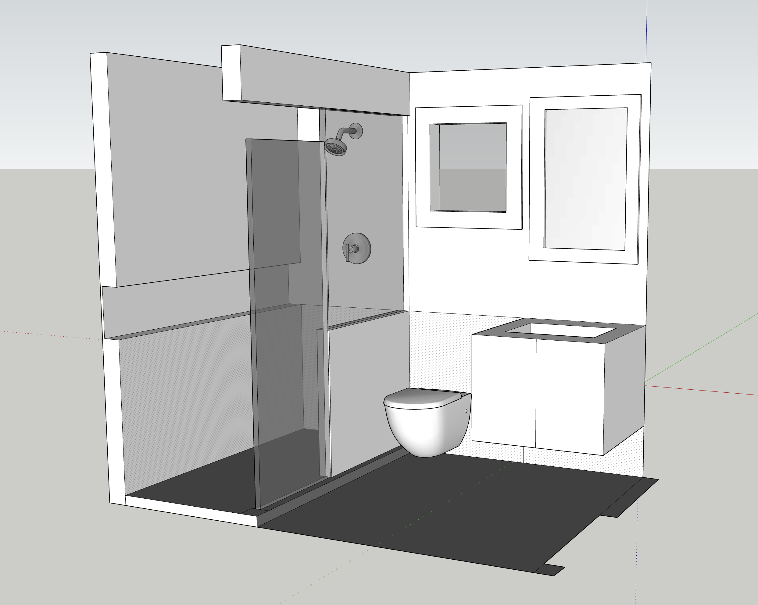 make the flooring in black tile make the toilet and vanity in black make the walls in white penny type tile matte black shower handle and head