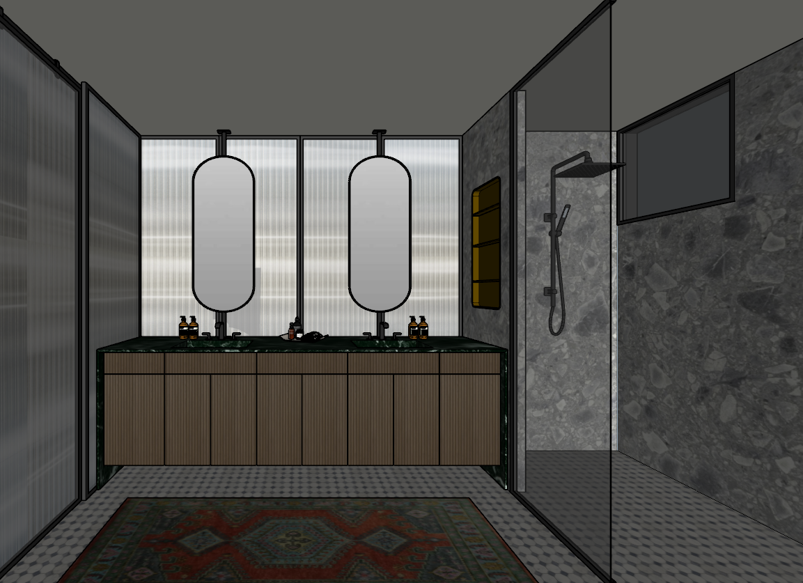the glass panels are not windows they are wall partitions keep everything as is but add the shower window back and make the back of the vanity glass