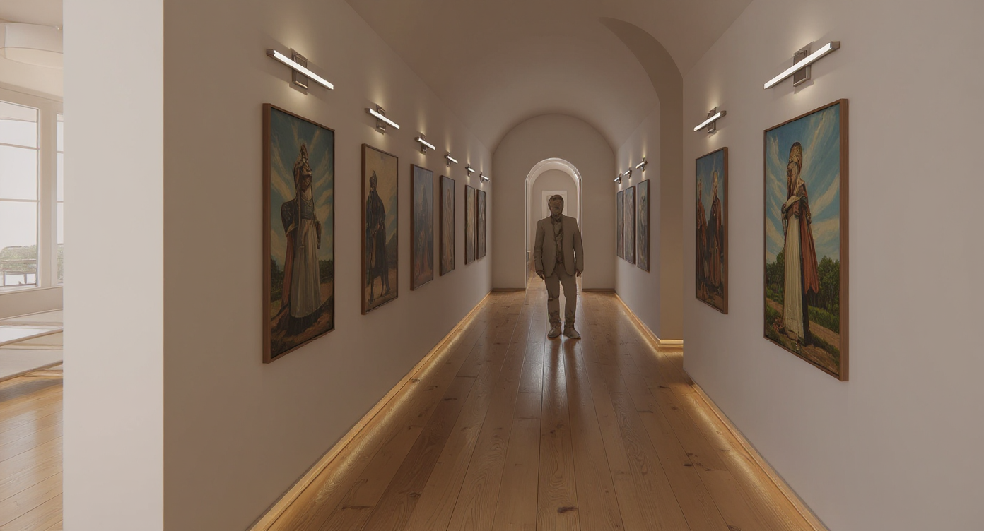coastal art on walls blonde hardwood floors linear accent lights on white baseboard at floor level