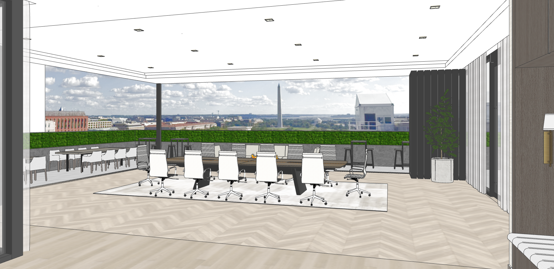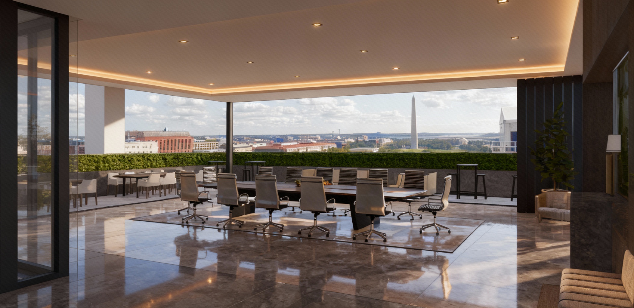 a luxurious modern penthouse interior overlooking the washington d c skyline with a clear daytime view of the washington monument the scene features a realistic blue sky with soft clouds visible through large floor to ceiling glass windows natural daylight floods the space complemented by warm interior lighting from recessed tray ceilings with elegant cove lighting the flooring is refined herringbone wood and the room is furnished with contemporary high end furniture in neutral tones a few upscale business professionals are casually interacting within the space dressed in modern elegant attire conveying a refined executive atmosphere all interior lights are turned on creating a bright balanced and inviting environment the rendering should feel cinematic photorealistic and sophisticated highlighting architectural depth natural reflections and the vibrant washington d c skyline in the background