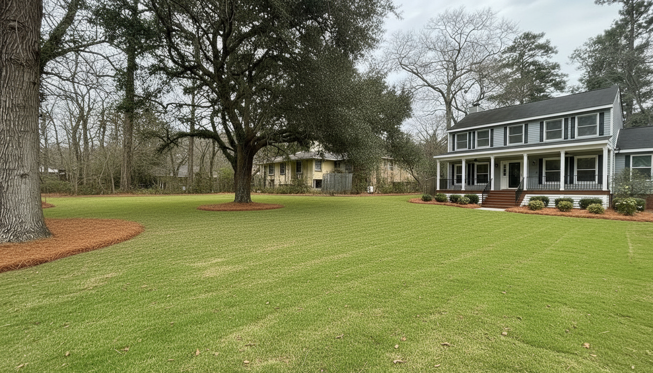 add a 12 foot wide bed of pinestraw between these two houses and their front lawns