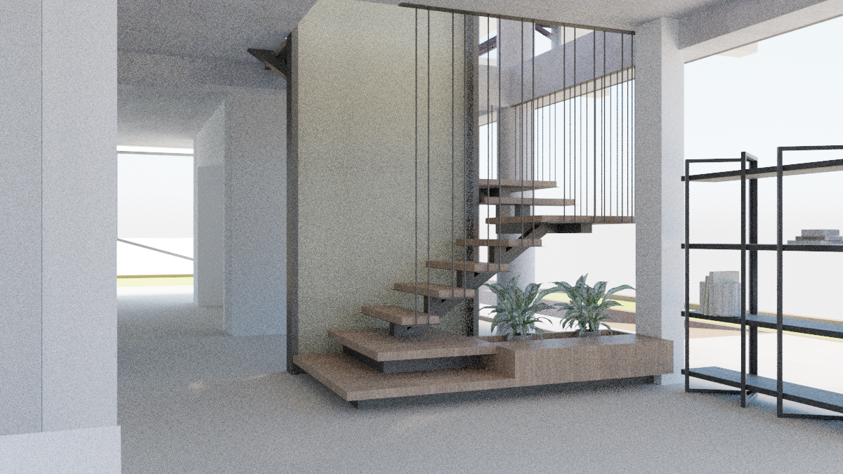 create a modern interior featuring a floating staircase with wooden steps and thin black metal supports the atmosphere should be minimalist and airy the staircase is illuminated by natural light streaming through large windows casting soft shadows on the polished concrete floor adjacent to the staircase place a light wood planter with green leafy plants adding a touch of nature include a sleek black metal shelving unit on the right with neatly arranged books and decor use a soft neutral color palette of whites greys and natural wood tones to maintain a serene and elegant ambiance put a baground of sky and some grass with trees