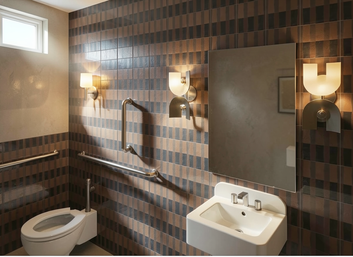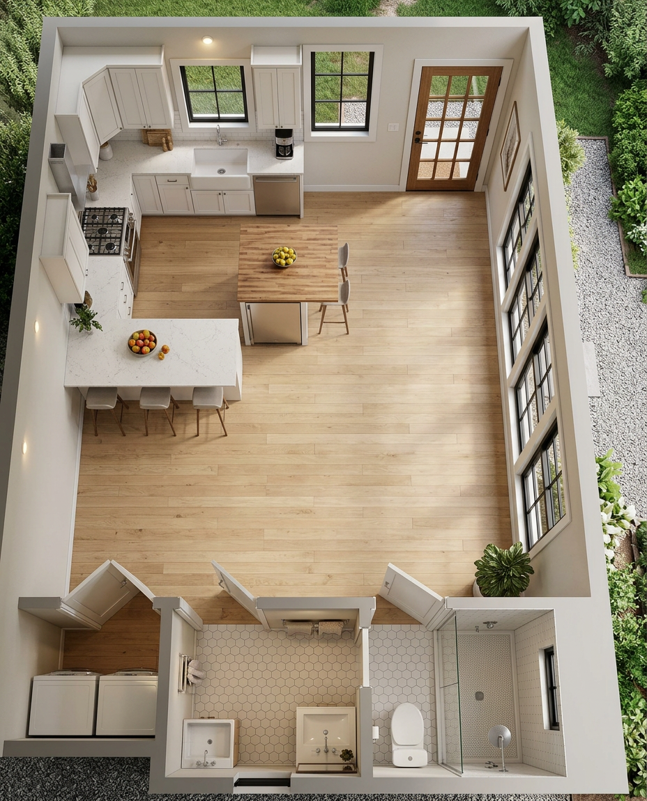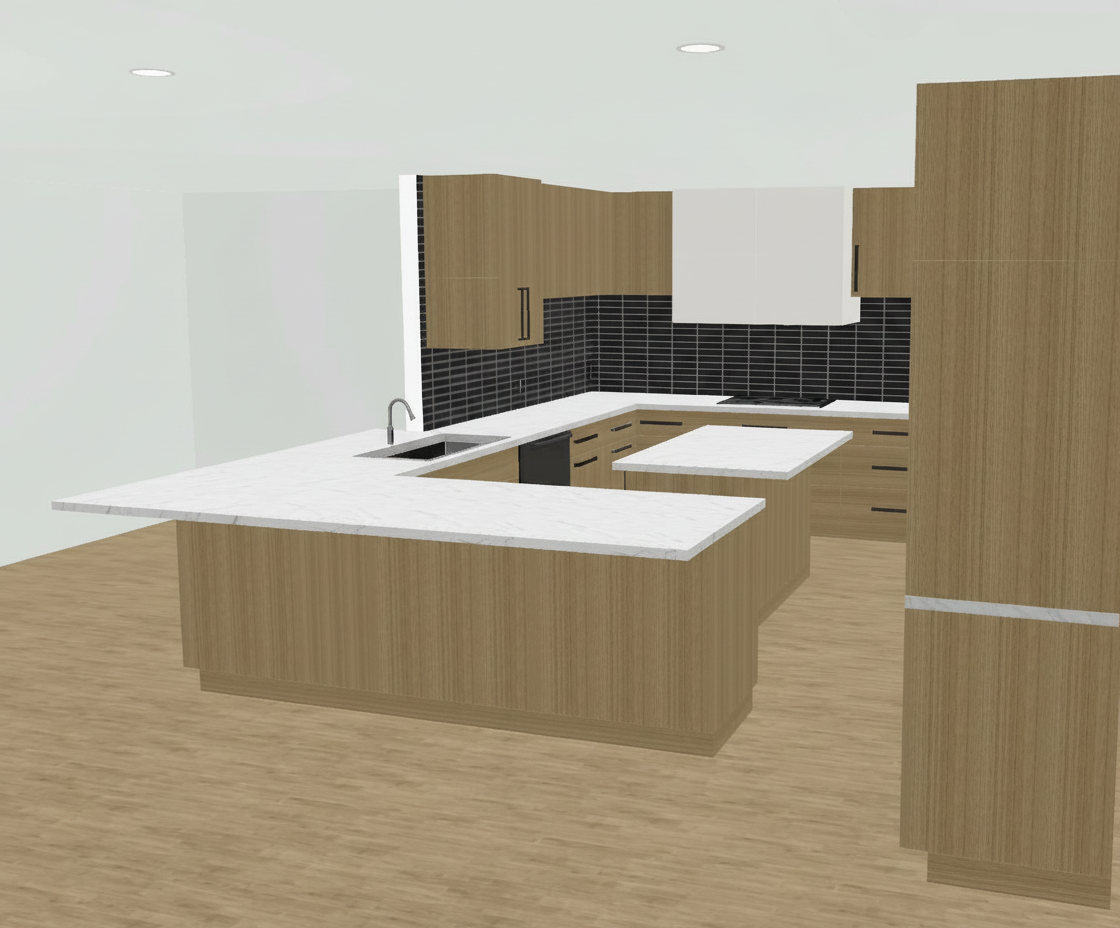 the cabinets are stained rift cut white oak the wall pattern is a wall paper the opening leads into a living room the counter top is white with red veins