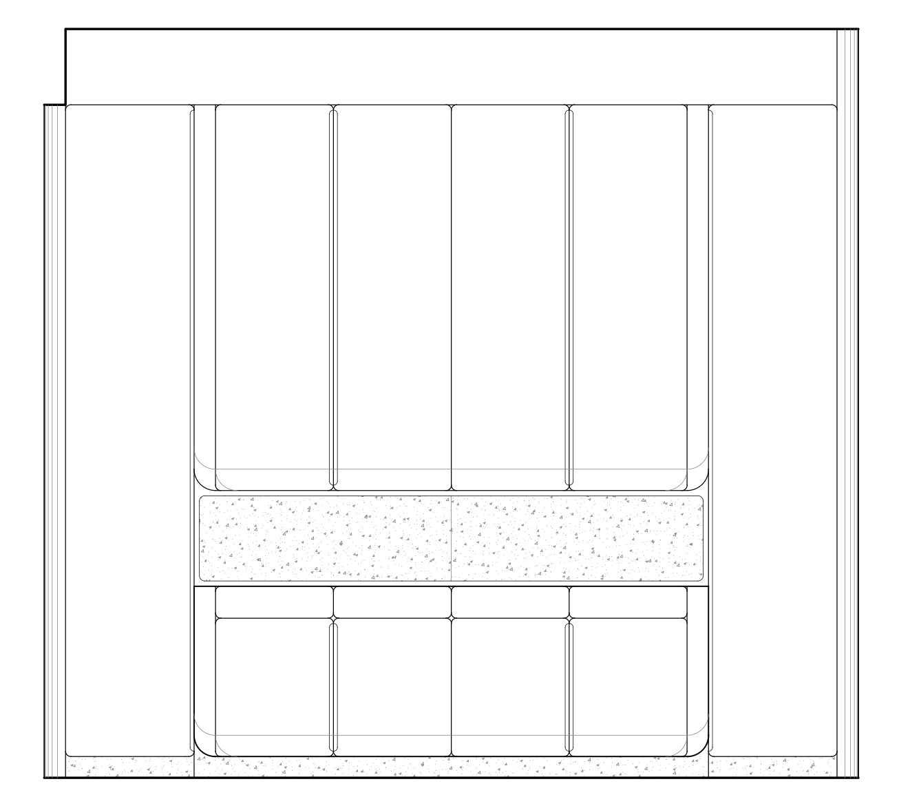 this is a hutch there are two ceiling height panels on the outer side and then cabinets in the center the top section of the cabinets is inset and the handles protrude out the bottom of these cabinets also is curved inward not concaved the bottom cabinets too are curved in this same way everything will be covered in the patina brass in the reference image everything that is in the speckled texture the backsplash and the toekick are in the brown marble you cannot see the counter top just the backsplash the outside edges are rounded as well of the entire thing