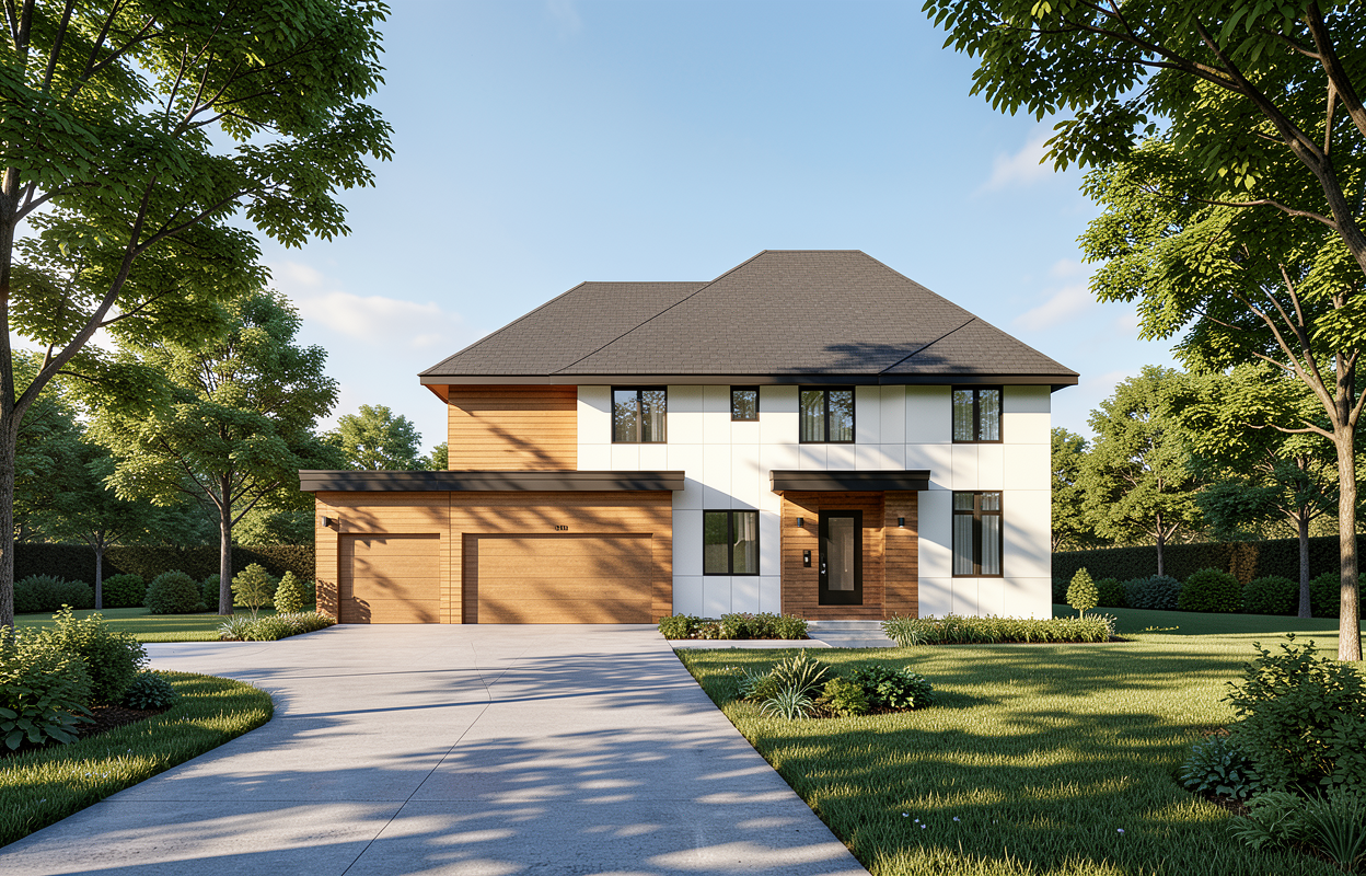 generate a high quality photorealistic render of the provided architectural elevation drawing preserve exact geometry proportions window spacing and material layout render at 4k resolution with ultra realistic daylight lighting clear sky soft shadows ambient reflections ensure all exterior materials colors and textures match the client s specifications exactly match the window grid style do not add any brick to the facade do not add extra dormers or light fixtures to the image use only the materials specified in the elevation drawing and color list match each component lighting should highlight color accuracy and realistic reflectivity use global illumination and hdri sunlight calibrated for afternoon warm tone maintain true color fidelity consistent exposure and physically accurate shadows add context elements landscaping realistic lawn shrubs and shadow cast trees suited to suburban setting create concrete driveway straight out from garage door with walkway from front porch to driveway background complementary skies matching exposure no distortion or overenhancement output a single landscape oriented photorealistic rendering that is architecturally faithful visually balanced and color accurate to the above specifications