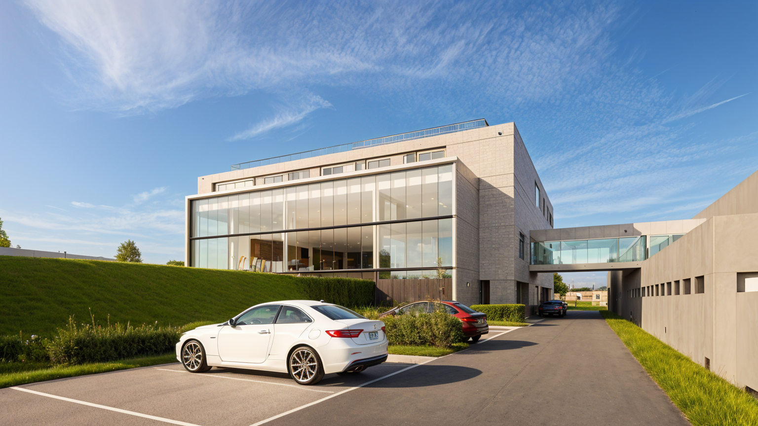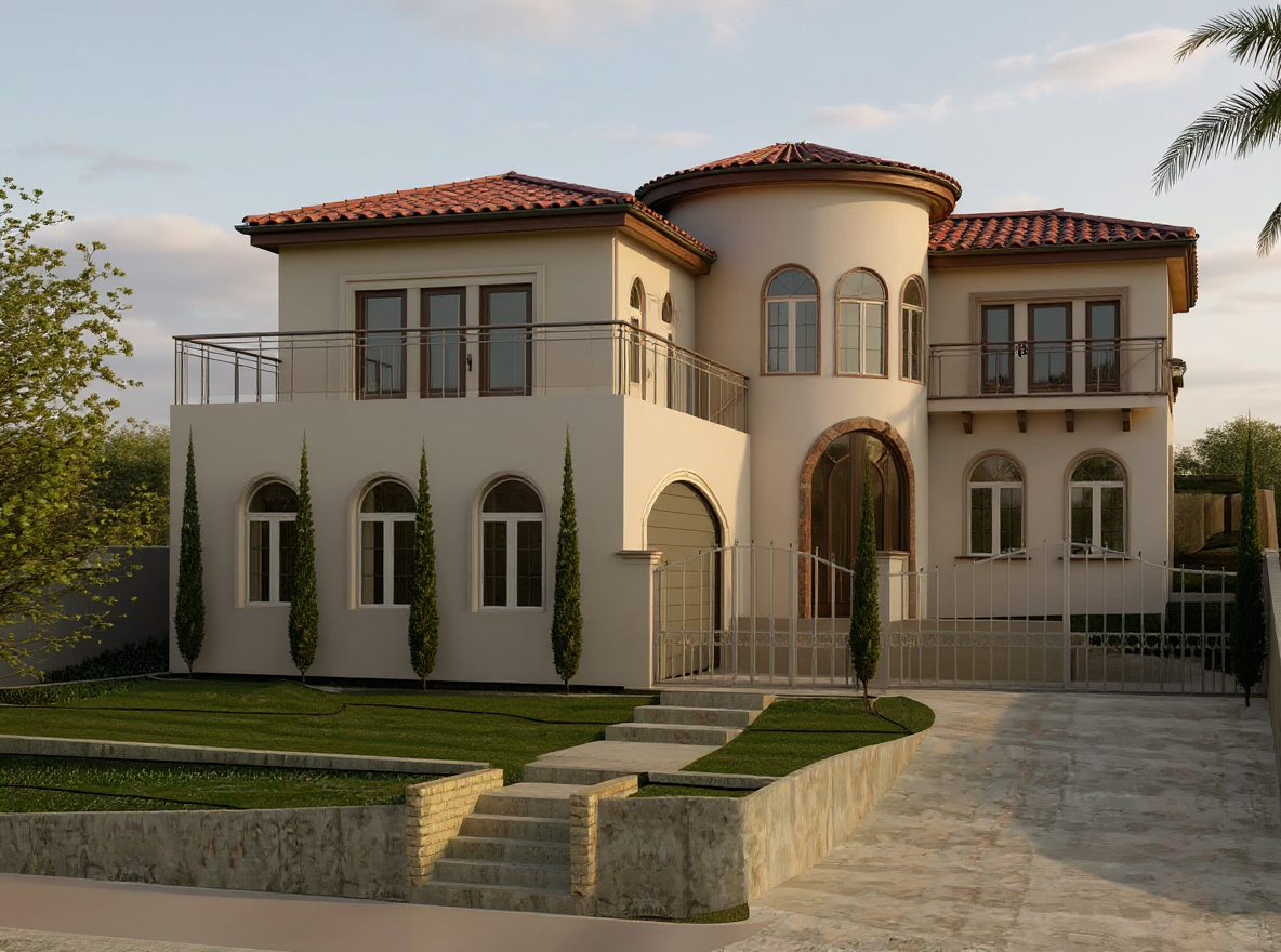 create a high quality rendering of a spanish style home exterior the roof features traditional curved terracotta clay tiles in warm earthy tones burnt orange rust and deep red with natural texture and slight weathering the exterior walls are smooth stucco in a light cream or warm beige include classic mediterranean architectural elements such as arched windows simple decorative trim and dark wooden accents add retaining walls constructed from textured stone or concrete block integrated into the landscape with subtle shadows and warm lighting the retaining walls should blend with the spanish aesthetic soft edges natural materials and a slightly rustic look include elegant exterior lighting warm led wall sconces with soft amber glow highlighting the stucco texture and casting gentle shadows on architectural lines pathway lighting should be minimal and warm toned at the entrance add modern black linen style metal gates clean lines matte black finish slightly textured surface and a refined contemporary touch that contrasts with the warm mediterranean materials surround the scene with drought tolerant landscaping such as olive trees palms agave and low shrubs use natural sunlight or golden hour lighting to emphasize color warmth and tile texture