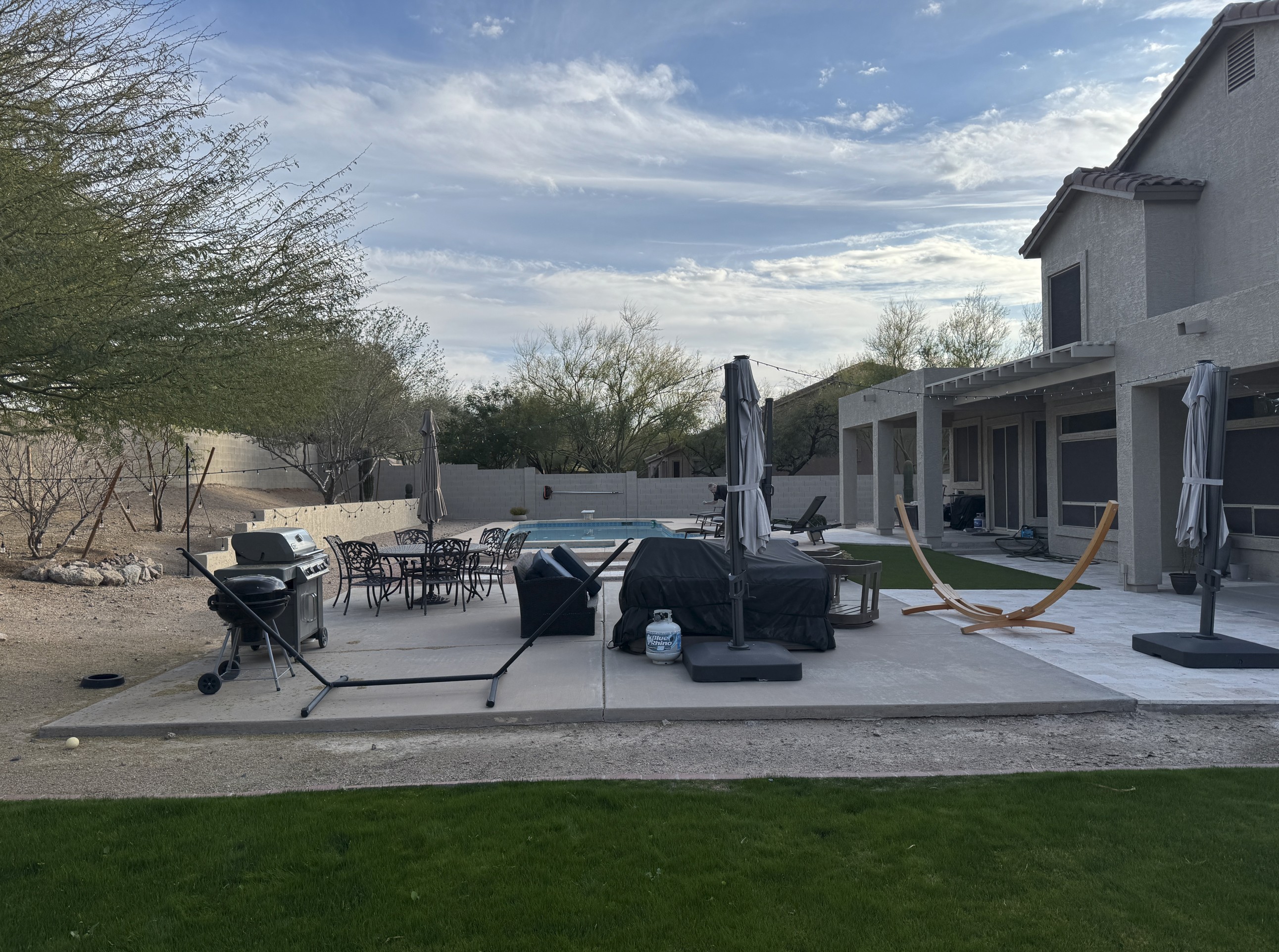 i m looking straight north at the new backyard ramada maintain this view construct a new free standing ramada with 4 wood post and a wood beam painted dec750 bison beige rl 649 wood fascia painted det695 grange hall rl 992 the roof will be concrete barrel shaped roof tiles desert tan the framed wall in the backdrop has adhered cultured stone veneer and 72 long low profile fireplace and a 54 flatscreen tv monitor above to watch american football sports the existing 25 x25 concrete slab is in the rear yard toward the north end to the south there is a 5 walkway of pool deck between the ramada and existing 6 x6 square spa and then a long rectangular pool extending south and out of the picture the pool and spa are centered on the new ramada and the pool is the same width as the ramada there is approximately 12 of pool deck between the pool and spa the pool and spa height are at the level of the walk there is an existing 6 high cmu wall approximately 20 north of the new ramada the cmu wall is painted de6214 pigeon gray rl 570 there is very short green grass between the ramada slab and wall with a 4 wide landscape rock path along the base of the cmu wall