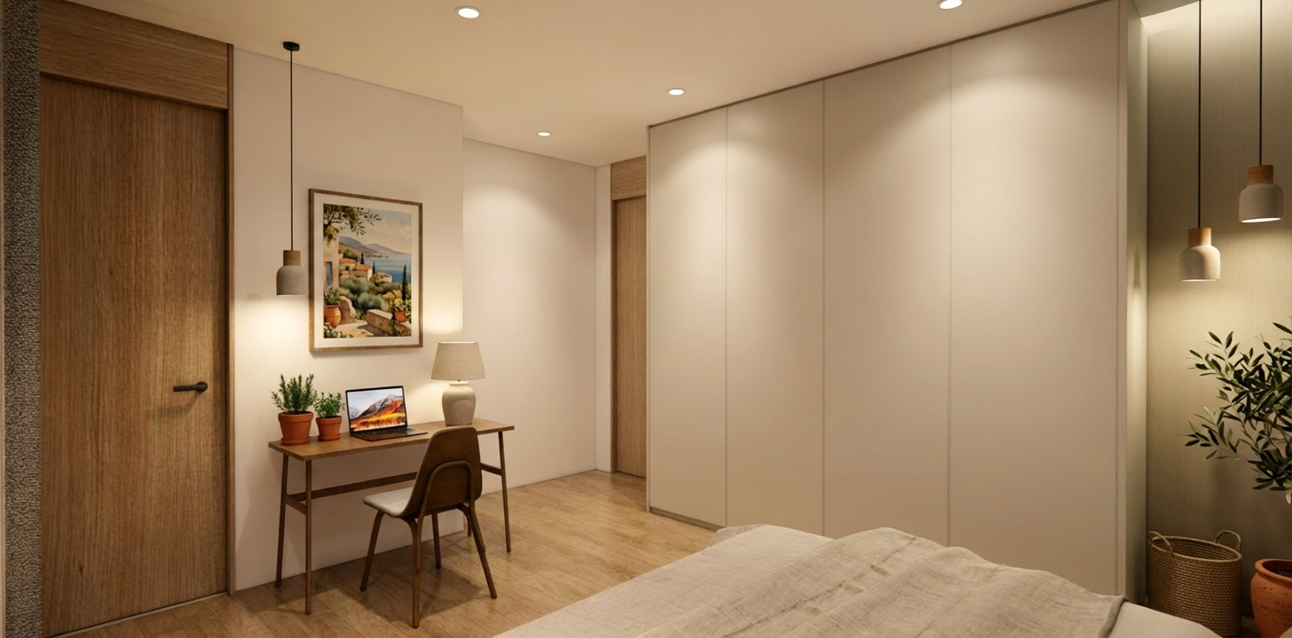 key everything including materials finishing touch up with artwork wood in light oak decor in a mediterranean style but do not obstruct any doors or openings