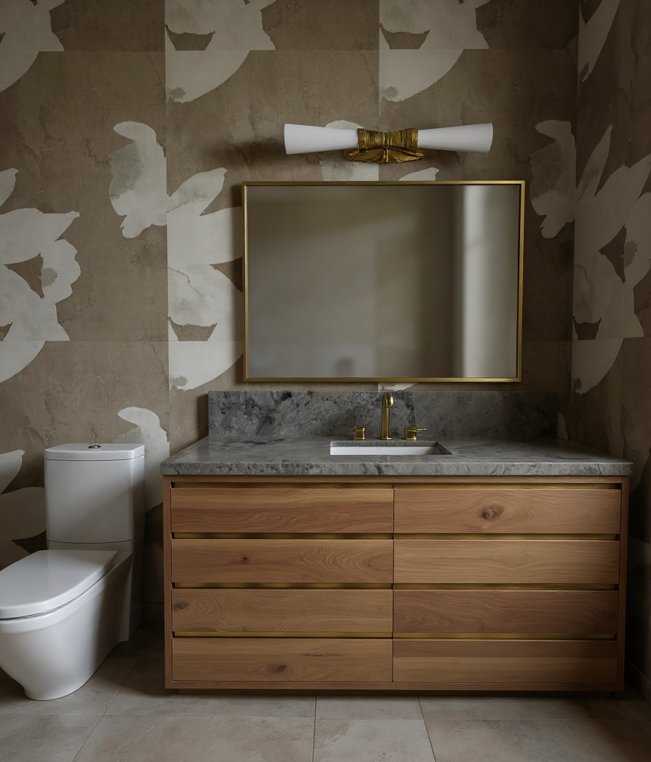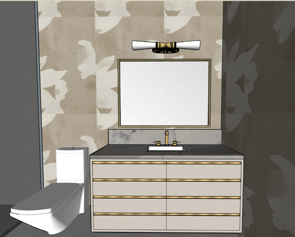 the vanity base is a cashmere beige and the countertop is a white marble with grey veins