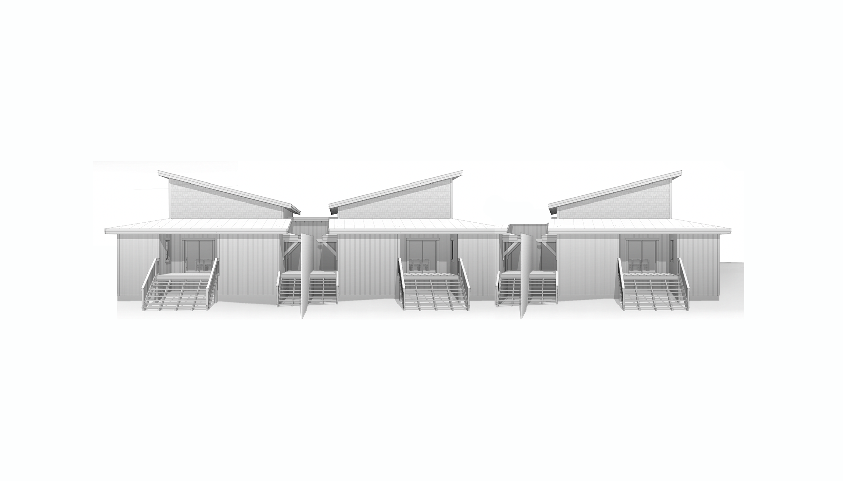 front view of a clean triplex architectural exterior home rendered in cinematic vibrant golden hour lighting triplex in a neighborhood setting with streaks of light coming through trees in the neighborhood warm glow and reflections off of the windows blue sky shining rustic select grade horizontal wood siding green manicured landscape around structure with gardens and patches of grass black standing seam metal roof prominent trees and neighborhood in the background high fidelity photorealistic visualization crisp shadow falloff refined facade geometry soft atmospheric depth premium architectural photography mood ultra clean composition and materials black window trim flat roof photorealistic render fence surrounding the property