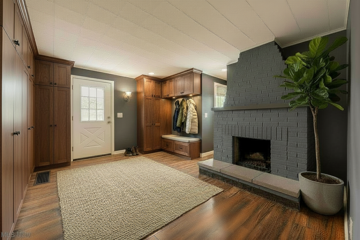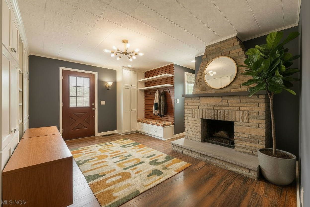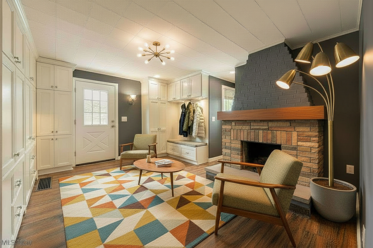 make the millwork cabinetry have a more midcentury modern style update the color scheme to be more midcentury modern too
