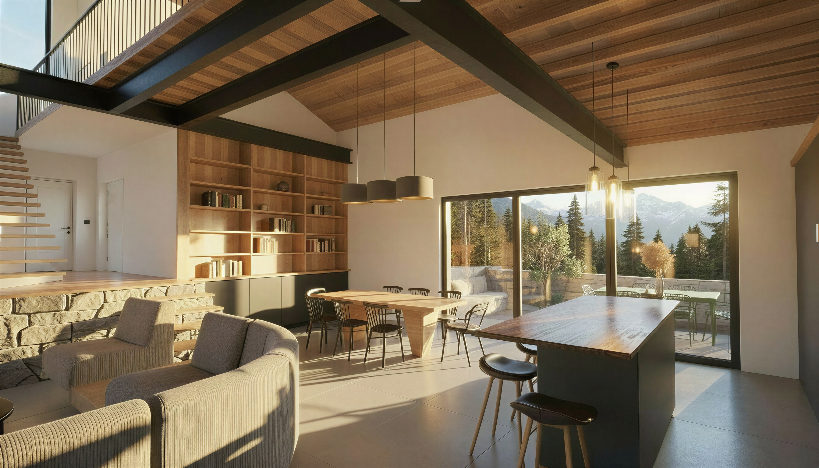 remplace les suspensions sur la table par des suspensions en verre fum met un plan de travail en marbre noir dans la cuisine