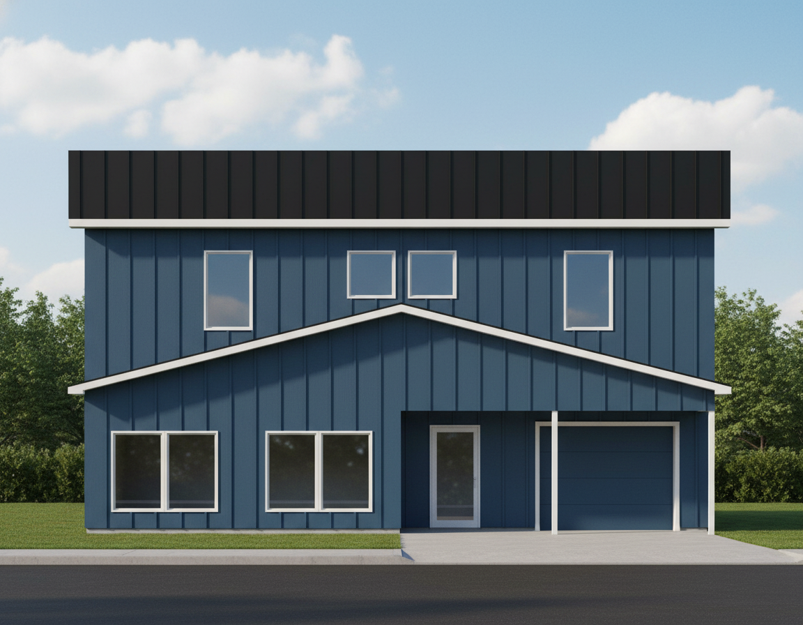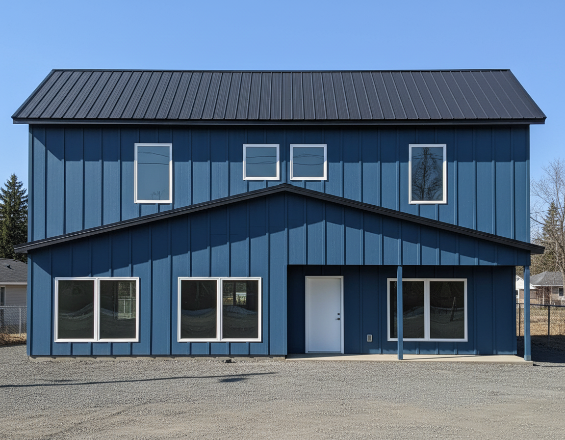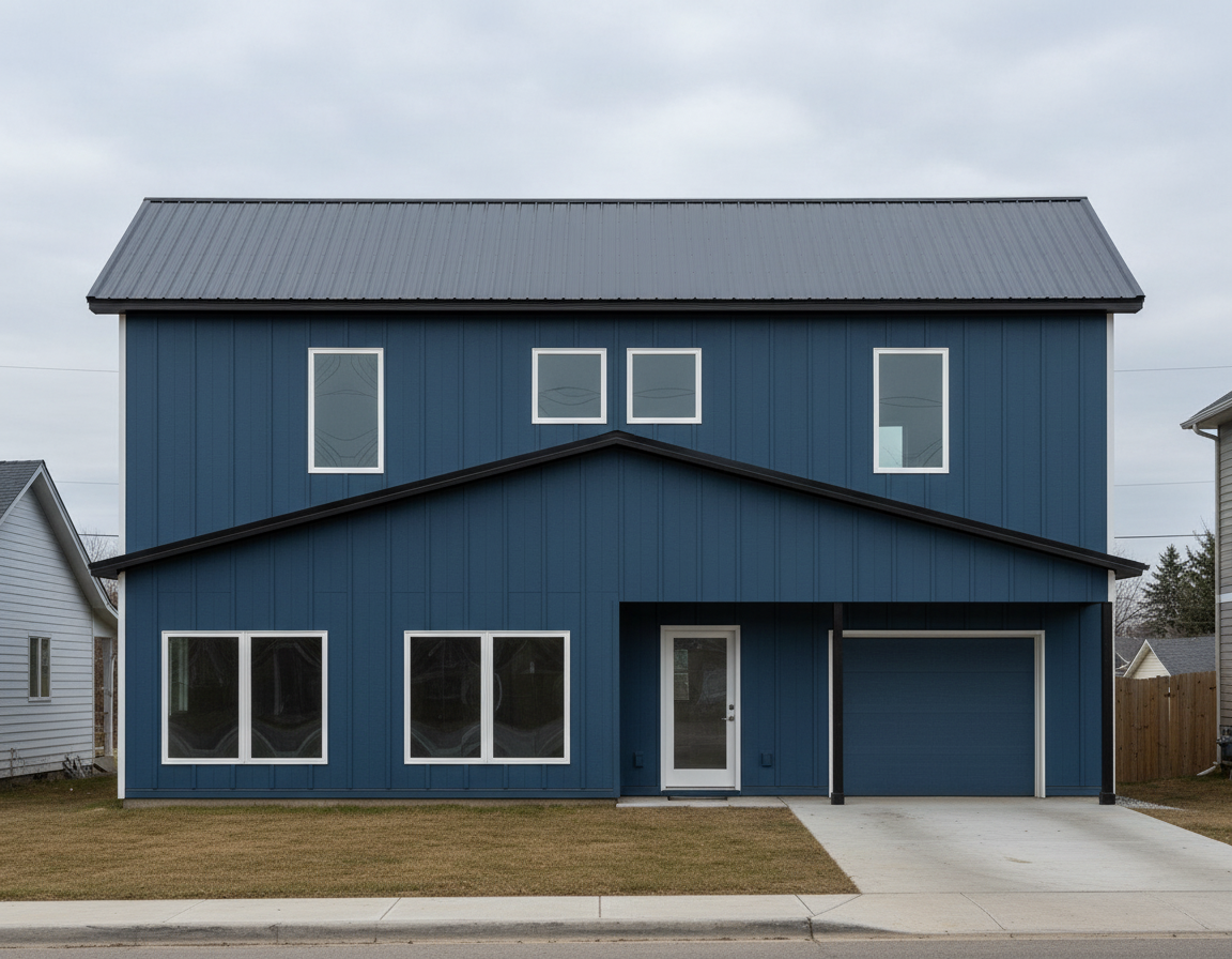 black metal roof blue metal siding white windows glass door and garage door also