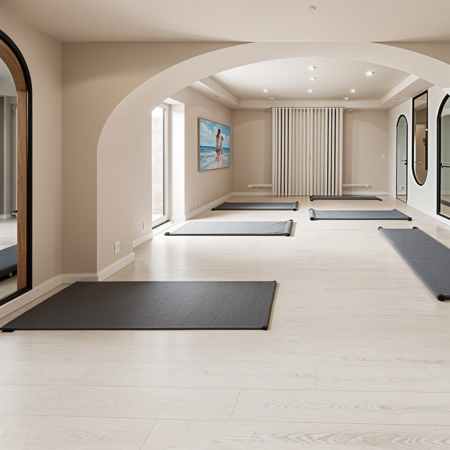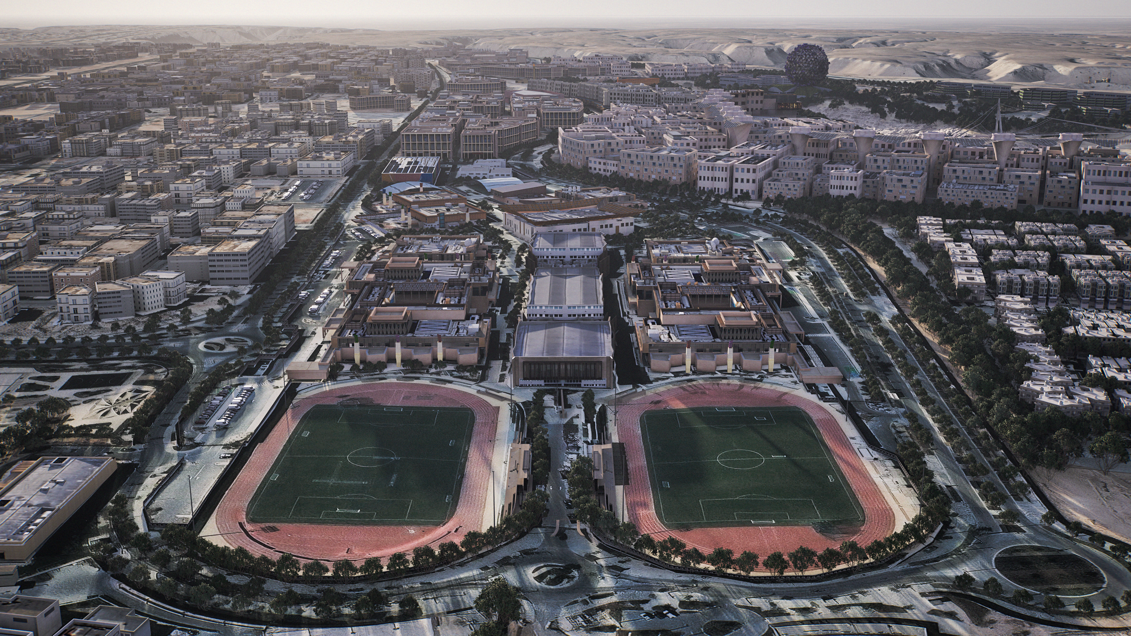 aerial view of a sprawling modern cityscape with a vibrant atmosphere two large symmetrical sports fields with lush green grass and orange red running tracks surrounded by meticulously arranged trees with rich green foliage the city is structured with a mix of light sandy brown and beige buildings conveying a warm harmonious blend with the desert backdrop the horizon features a sweeping sandy desert landscape under a soft dusky sky with gentle hues of lavender and light peach streets are lined with shadows adding depth and contrast to the urban environment creating a serene and balanced composition