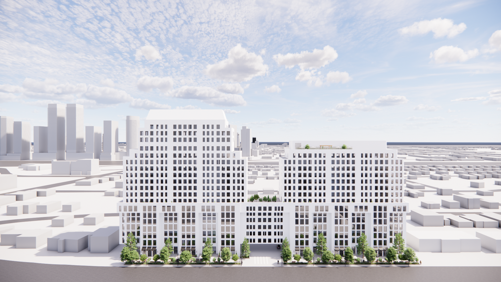 maintain the building geometry and have white limestone material on the podium and light brick colour on the higher levels