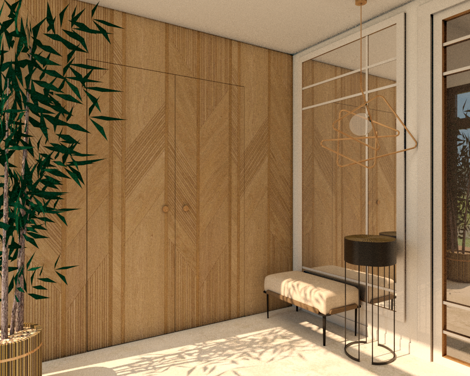 a modern cozy interior space with a minimalist aesthetic the backdrop consists of elegant wooden paneling in warm oak tones featuring a subtle chevron pattern for texture a plush light beige bench rests prominently its fabric complementing the neutral color scheme to the side a sleek modern side table in matte black gleams softly in the ambient light above a geometric pendant light fixture in polished gold adds a touch of sophistication a large mirror adjacent to the bench reflects natural light contributing to the airy atmosphere beside the mirror a lush green indoor plant adds a vibrant contrast housed in a gold patterned planter the overall atmosphere is serene and inviting with sunlight streaming through a large window casting soft shadows and enhancing the calm harmonious vibe of the space