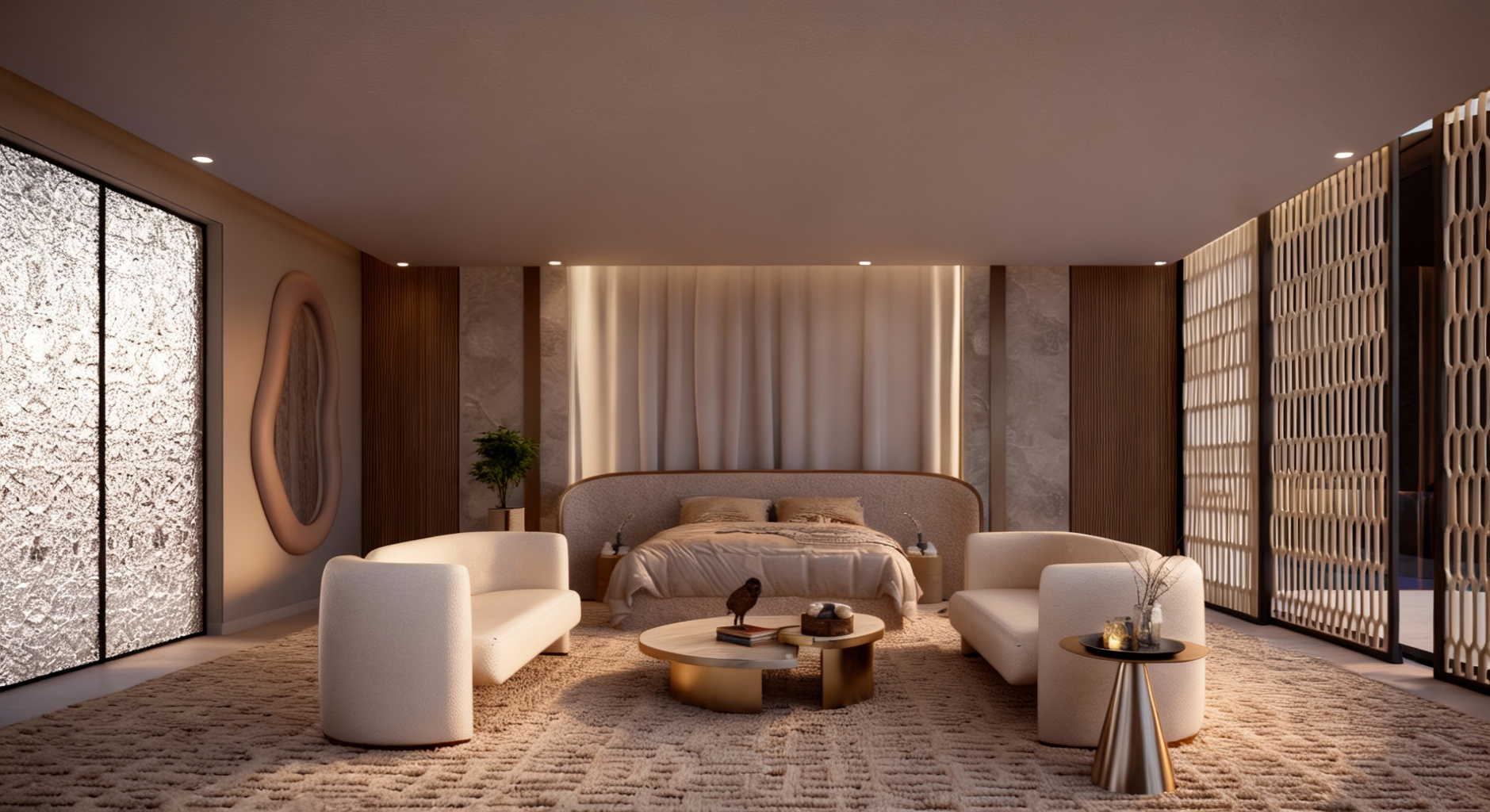 exterior shot create a realistic daytime architectural visualization of a residential house the facade is clad in white natural stone laid horizontally with clean and precise detailing the roof is made of light gray metal roofing with a subtle texture in front of the house there is a landscaped hedge with trees and an asphalt access road the neighboring buildings are rendered realistically in neutral gray tones so they do not distract from the main building the upper terrace features a natural wood floor and clean white walls the scene is lit by natural daylight resembling a realistic daytime photograph with accurate materials shadows and proportions