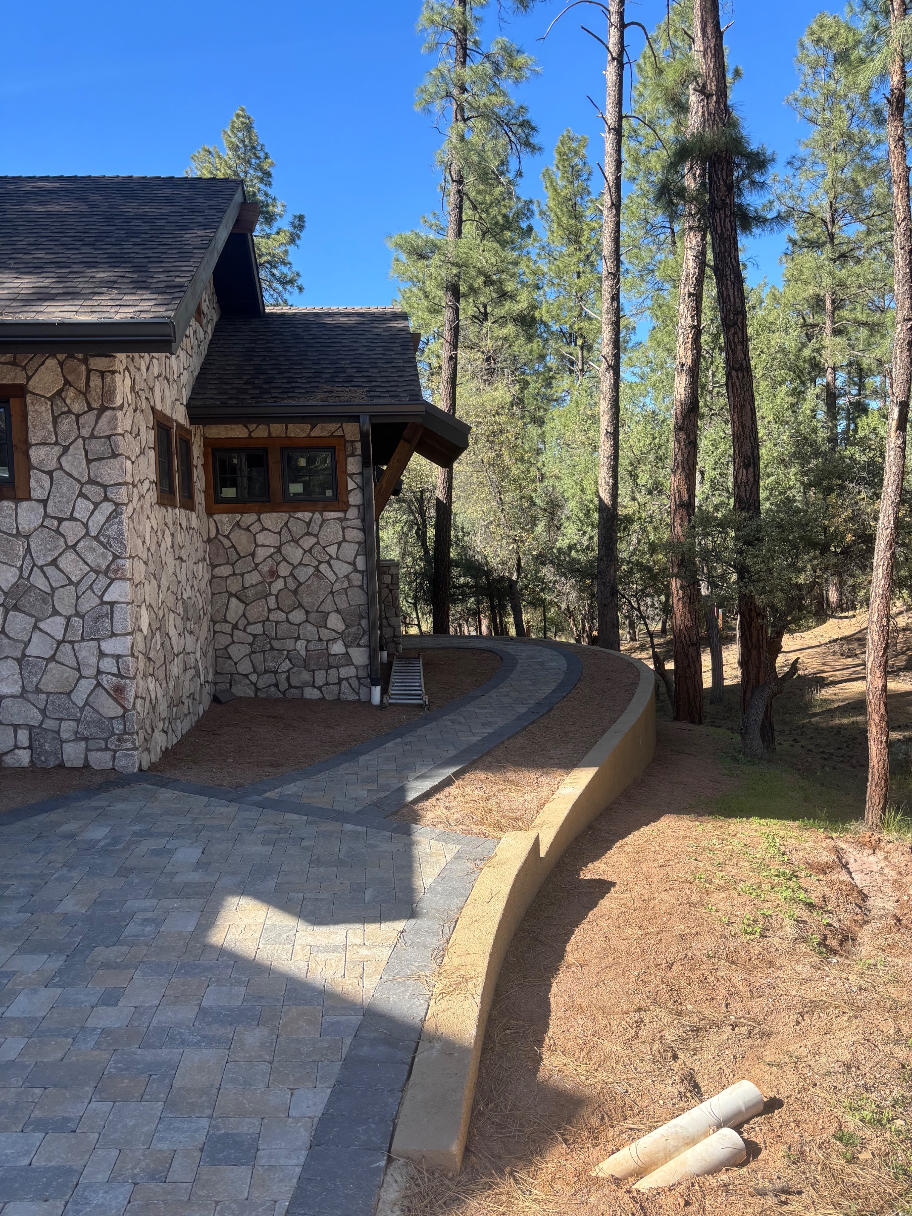 add a railing on the curved retaining wall plant boxwood carpet roses and lavender in the dirt along the path