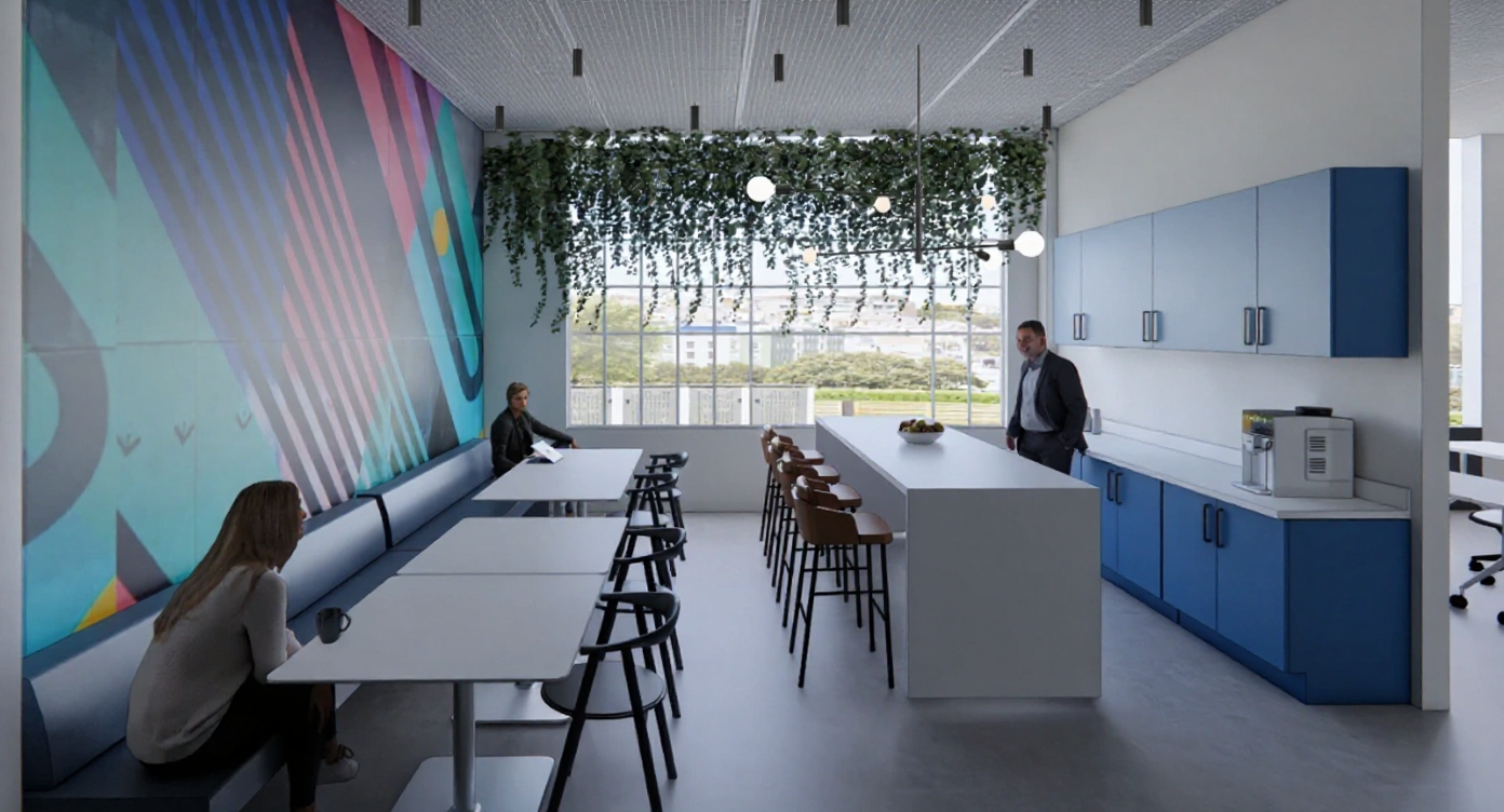 create a warm living room render using peruvian inspired colours for rugs under the table and tiles under the fire place warm light wood custom bench with colourful cushions and plants and books stocked in the shelving system this should blend japanese and peruvian interior styles with white walls and small pops of colour