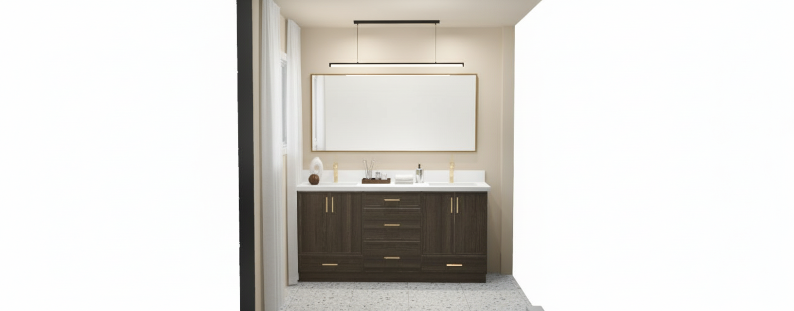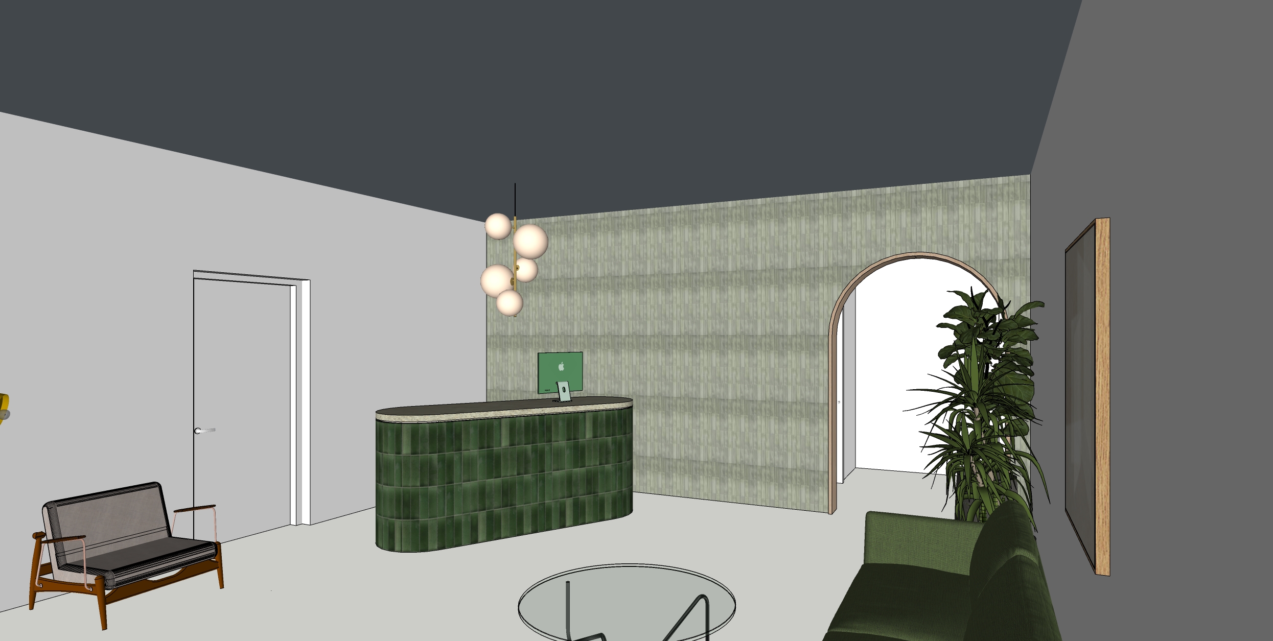 a modern upscale interior with a sophisticated minimalist design the walls are painted in an elegant warm off white wall with the arch opening has green tile furniture in natural wood stone soft fabrics natural touch to the modern space the atmosphere is serene and sophisticated illuminated with soft warm ambient lighting architecture maintain colors and materials
