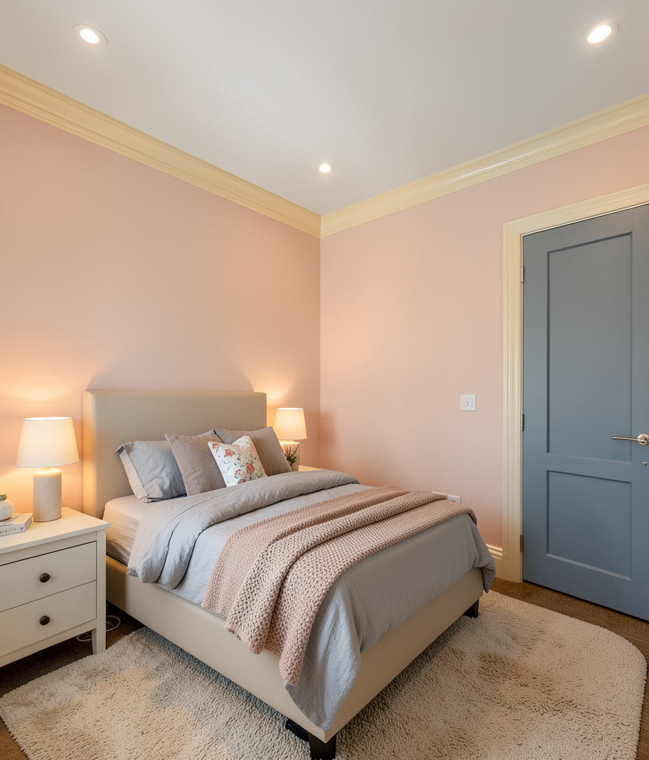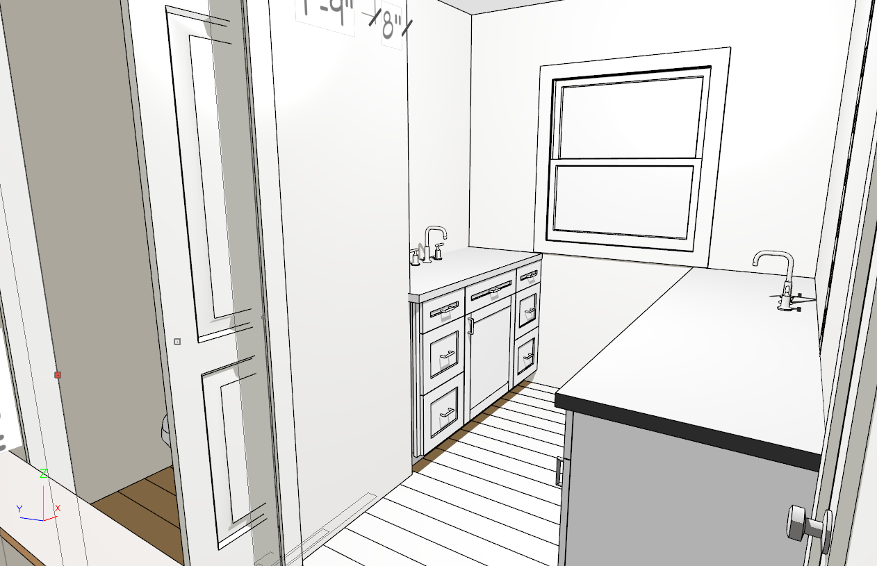 interior shot create a rendering of a modern bathroom from this perspective use sleek wood grain cabinets with marble countertops and sleek chrome faucet and chrome cabinet pulls add a round lit mirror above sink with soft blue walls architecture