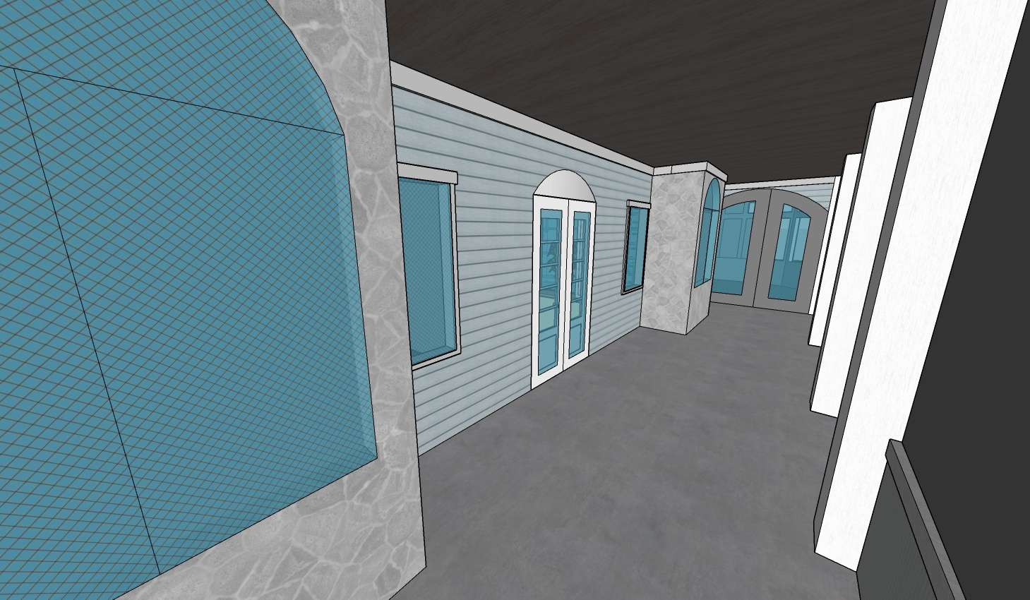 create a screened in front proch the wall to the left is the house wall and should be sided in a light blue horizontal lap siding all of the windows should have white framing and trimwork the ceiling should be a blue painted wood beadboard the stone accents on the walls should be an off white stone the glass in the doors and windows should be a smooth texture with a tint so that you cant see through them