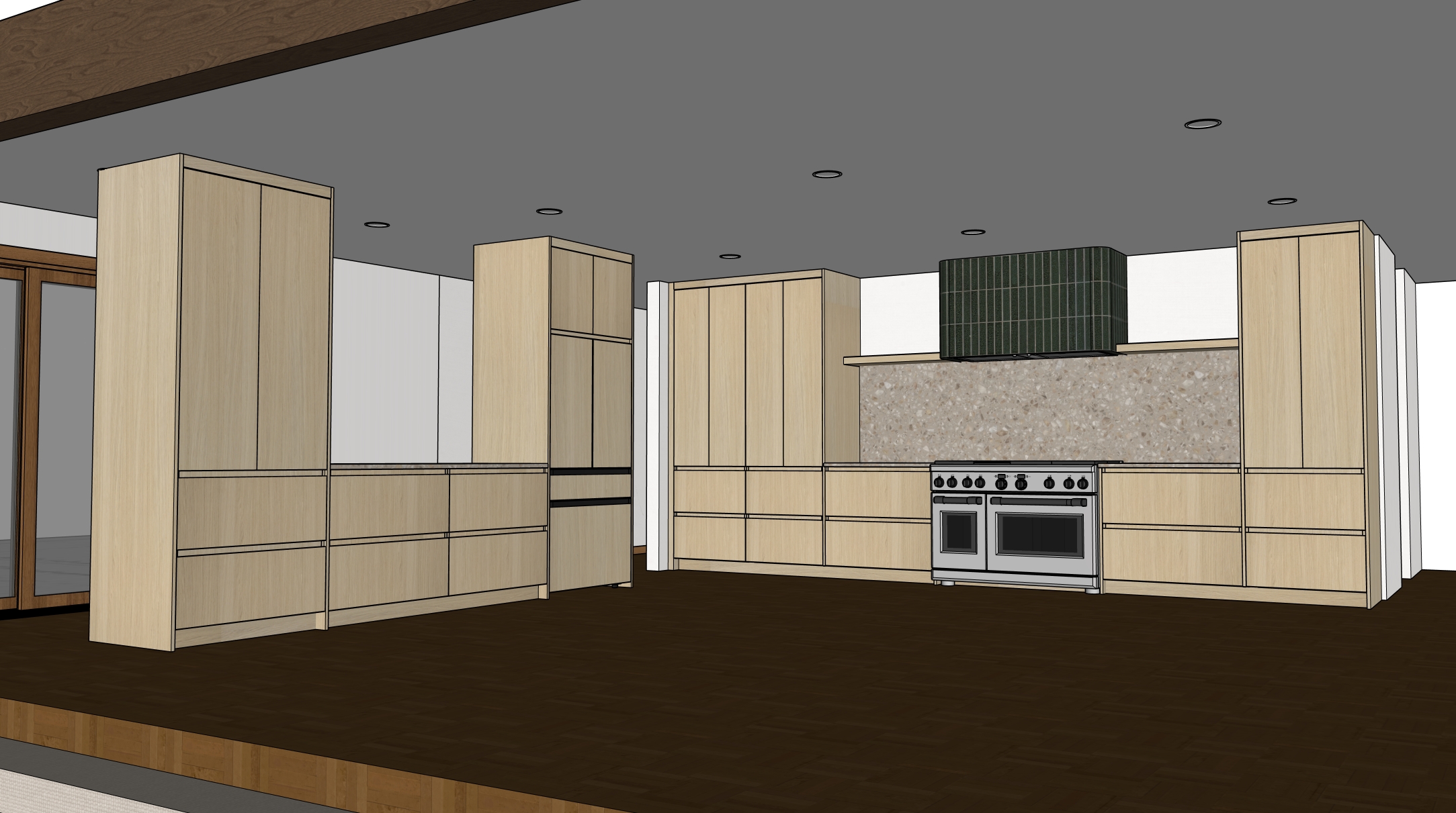 soft morning light walls are white lightly textured drywall can lights are on there are no windows directly to the left and right of the range there are no cabinets between the 2 tower cabinets on the left hand side of the image front of the stair tread is the same material as the floor