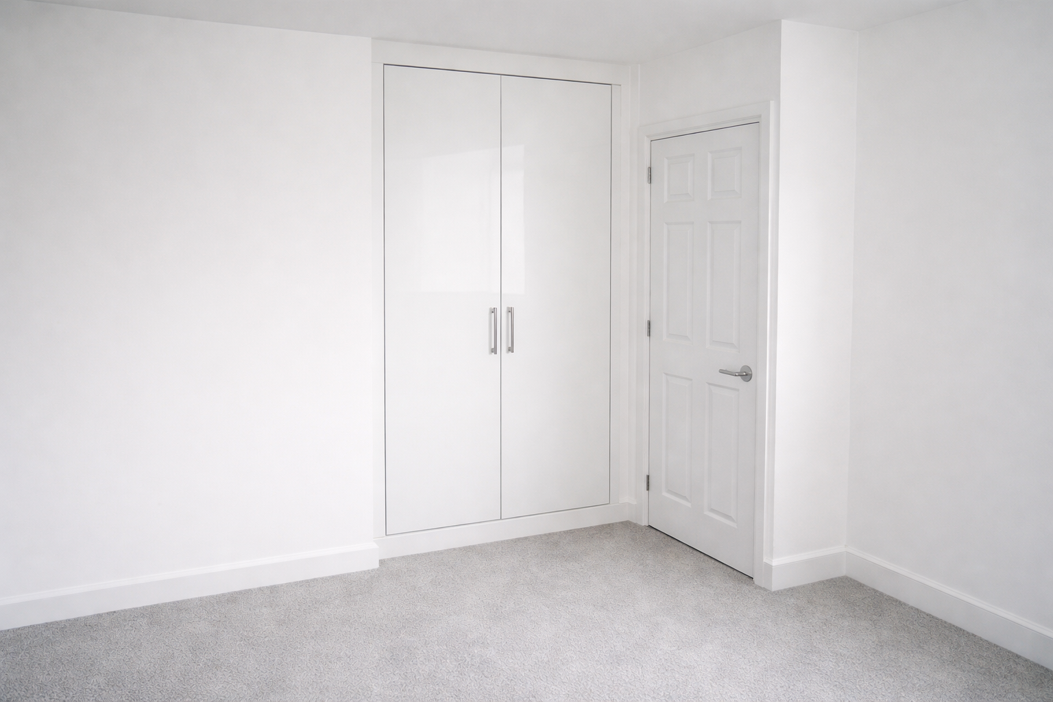 this is a wardrobe in an alcove render it with the follwoing changes make the fitted furniture light cream in colour make the internal walls white make the flooring light grey carpet do not add any lightinginside the wardrobe do not add anything