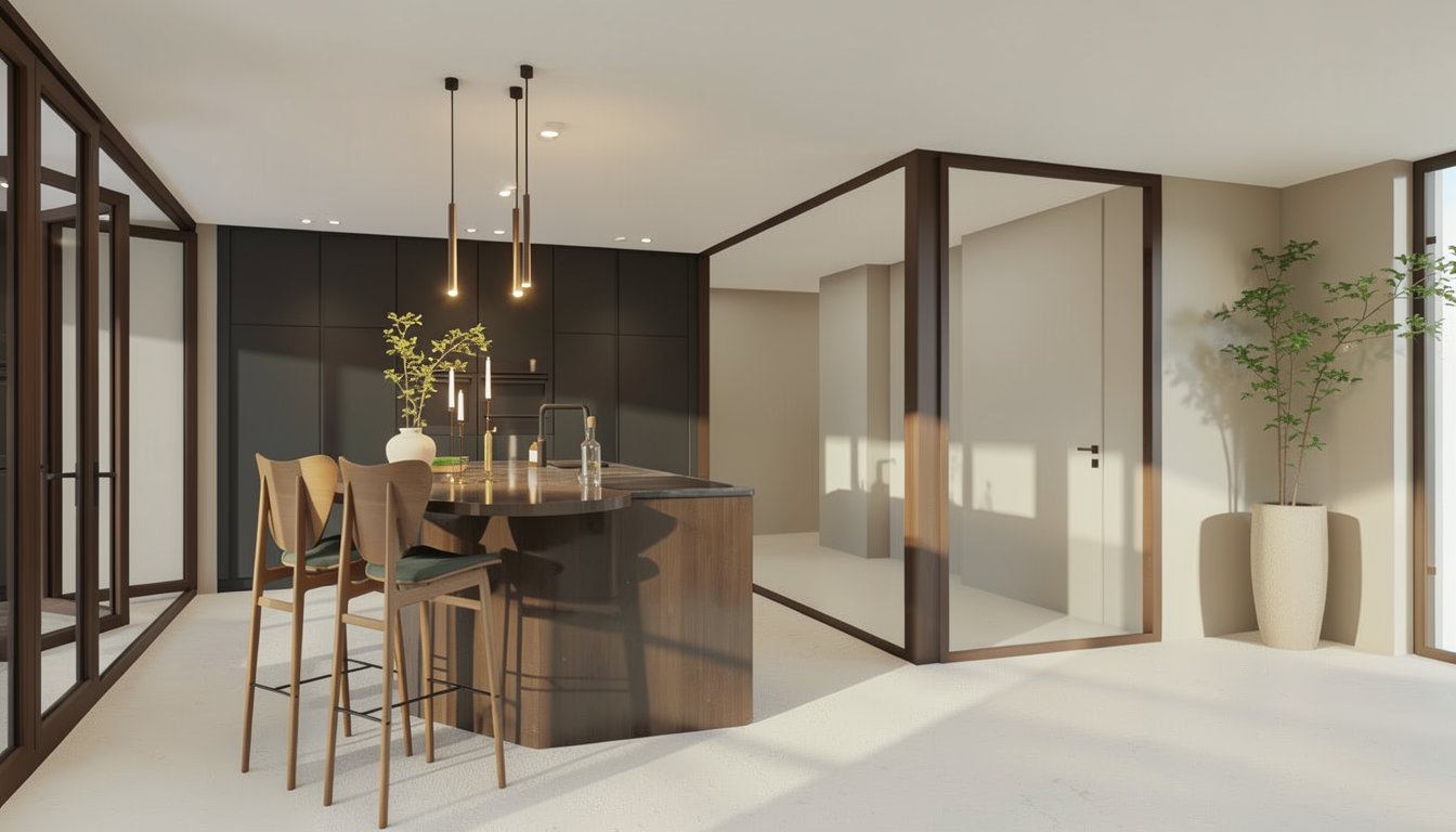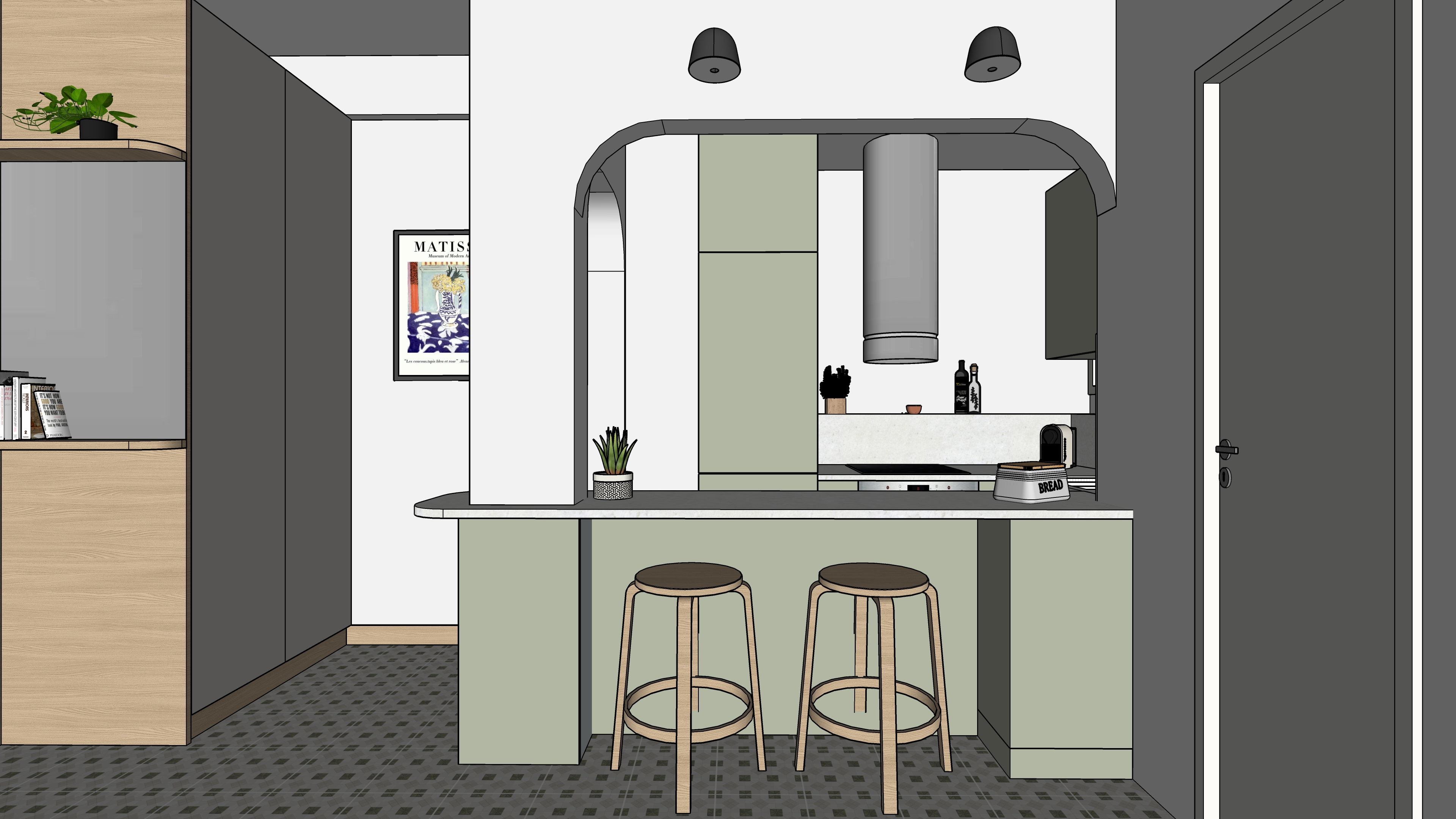 this is a renovation of an apartment the tile has a specific pattern that you should keep the walls are white the kitchen cabinets are light green from benjamin moore saybrook sage hc 114 the hood is inox mat the skirting board is light oak wood the stools are light oak wood the cupboard on the left of the image is white on the oak part of the cupboard there is mirror the sconces are dark grey the light is artificial