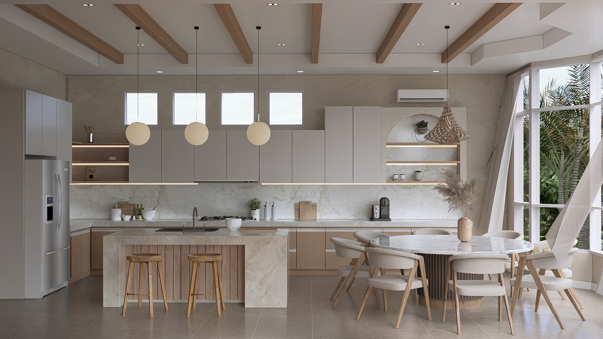 award winning architectural photography of a dining room with a show kitchen interior shot hyper realistic crisp neutral natural white daylight mixing with subtle ambient illumination 4000k color temperature creating a clean balanced and striking spatial atmosphere high fidelity ray traced shadows with realistic variable penumbra contact hardening deep rich ambient occlusion ao grounding all geometry accurate light falloff and soft shadow transitions realistic global illumination clear specular highlights shot on 24mm tilt shift lens f 8 aperture iso 100 for sharp clarity 8k resolution highly detailed path tracing physically based rendering pbr v ray 6 style sharp focus pristine quality