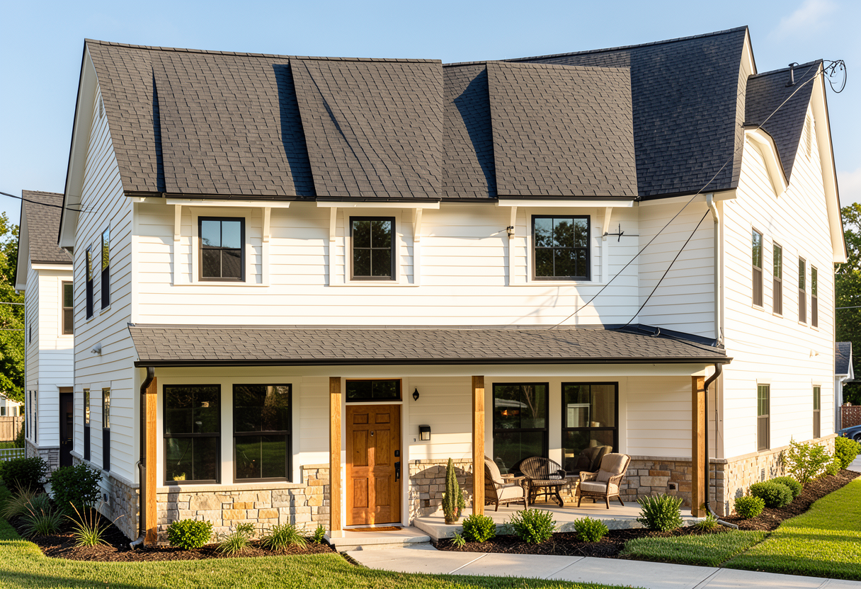black asphalt shingles white brick walls wood columns black coronis