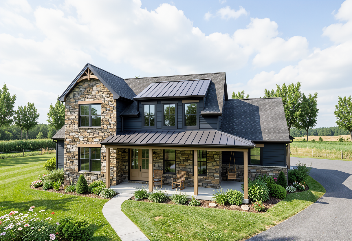 zaha hadid exterior shot add a dark gray charcoal scalloped roof with a modern european cottage style for brick and vertical siding style full landscaping around in a neighborhood setting architecture