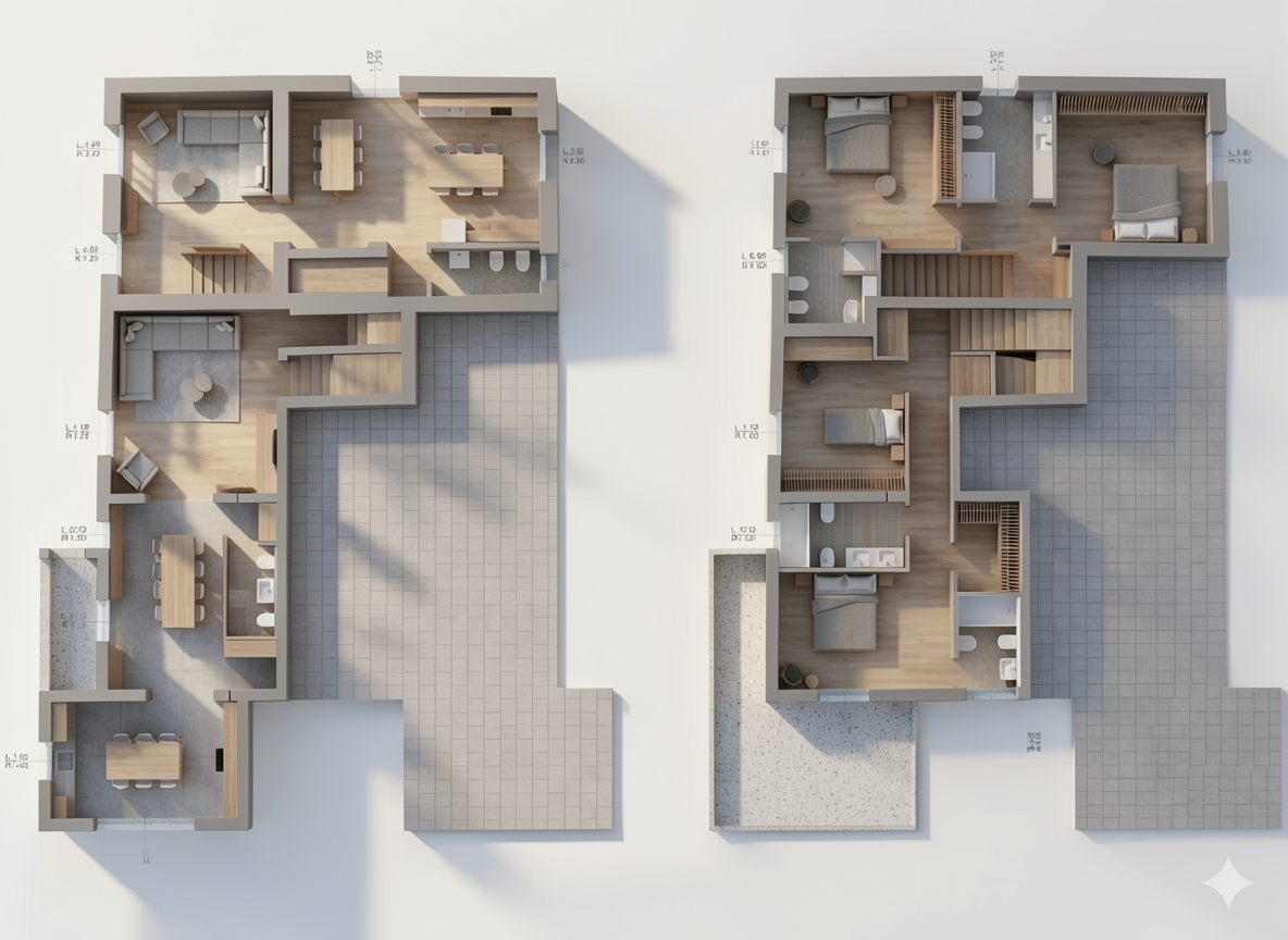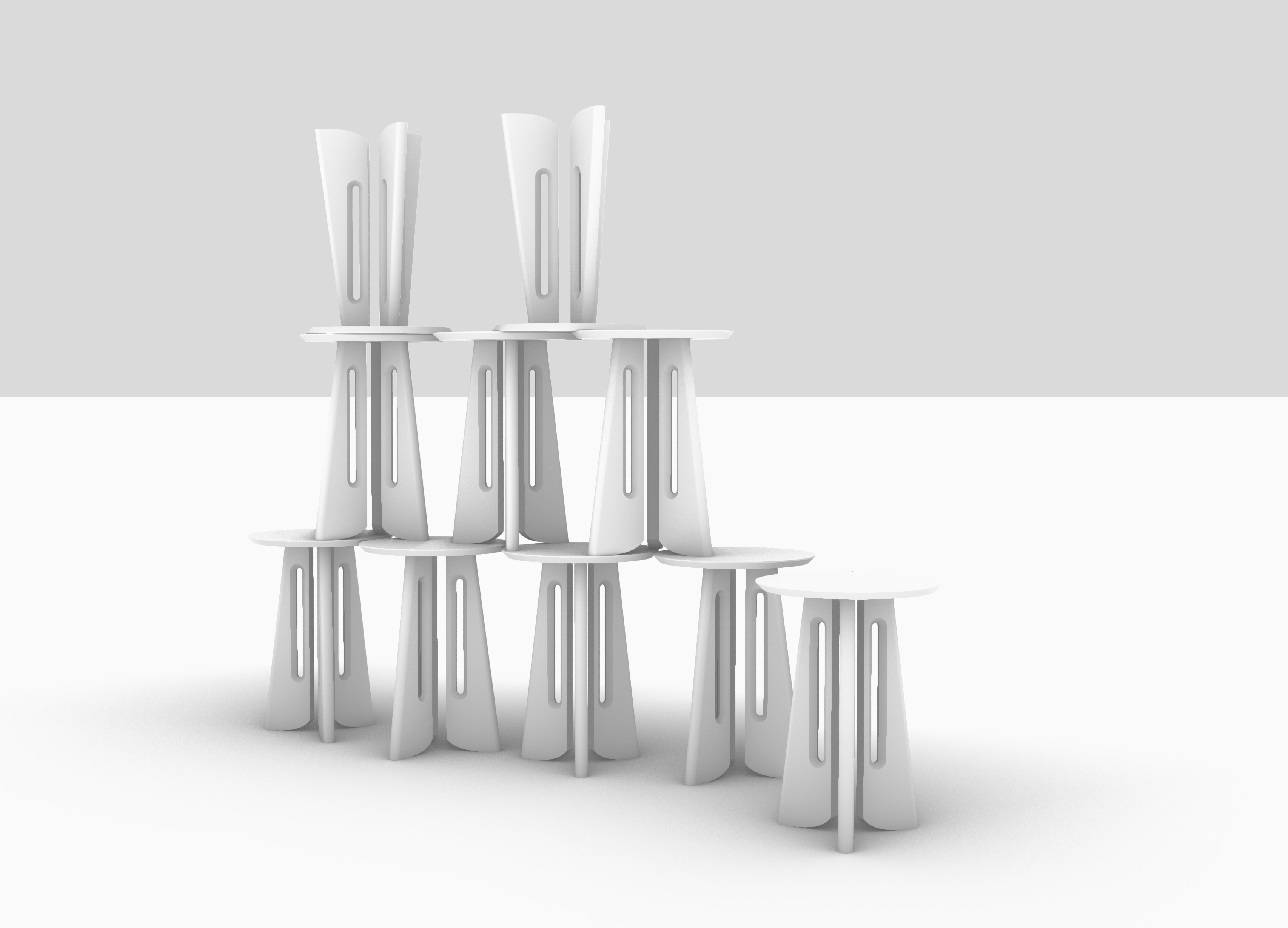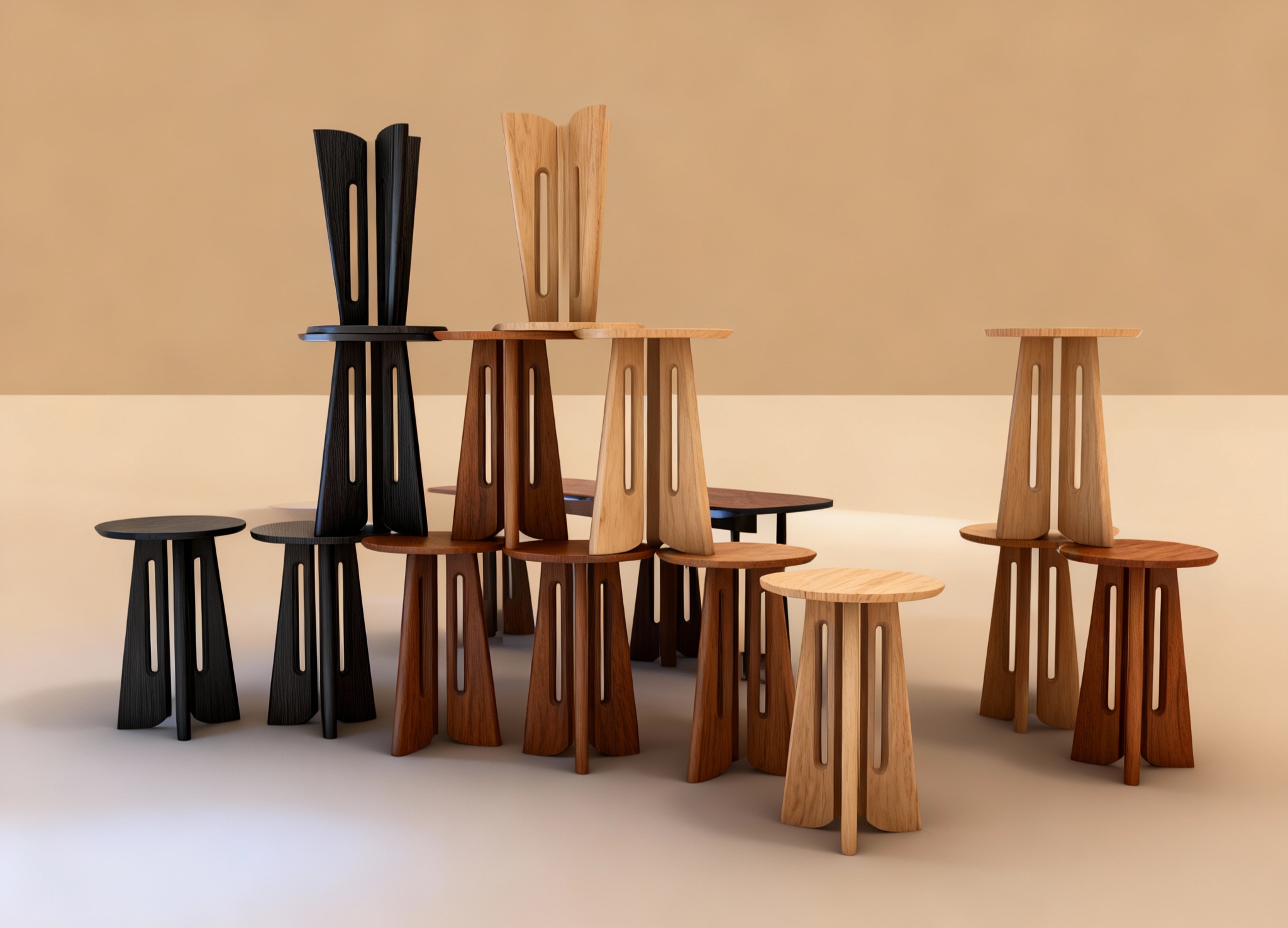i want these tables rendered i want some of the tables to be a black wood finish but you still can see the wood grain i want some tables to be natural maple wood i want some tables to be natural walnut wood i don t want the wood grain to be very wild the wood grain should be fairly straight but still relate to the average grain that species of wood has i want these differently finished tables to be mixed together i would like the background to be a photography sweep that is a really pleasent tan color and i want to it be one smooth color gradient the lighting on the tables should be cooler light but not too cool stick close to the original layout of the tables of the source image