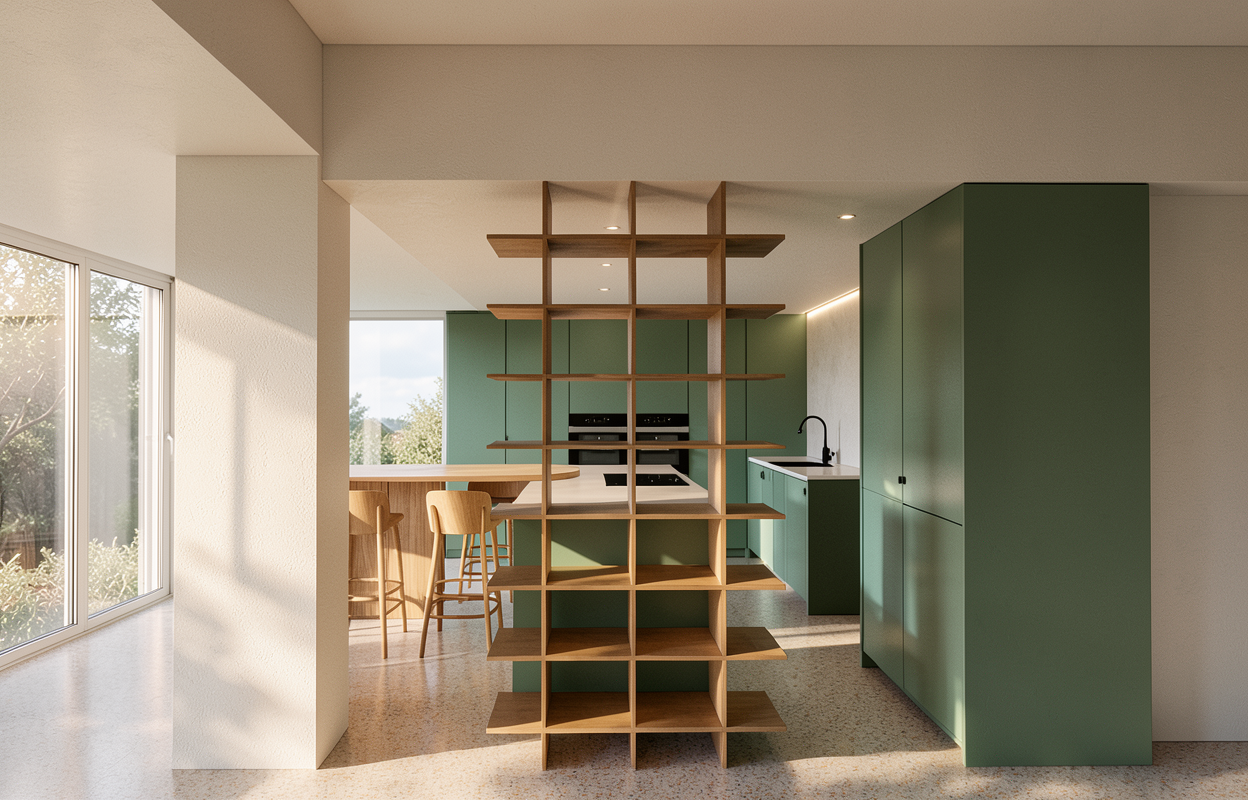 a modern kitchen with soft greens woods and a terrazzo floor the worktop is a light textured offwhite matt worktop